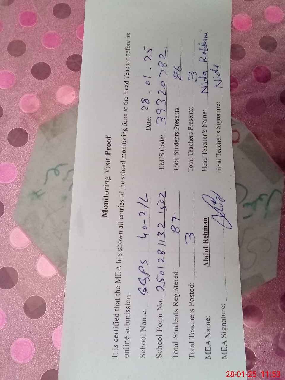 | Attendance Register | Head Teacher | MEA with School | Visit Proof |