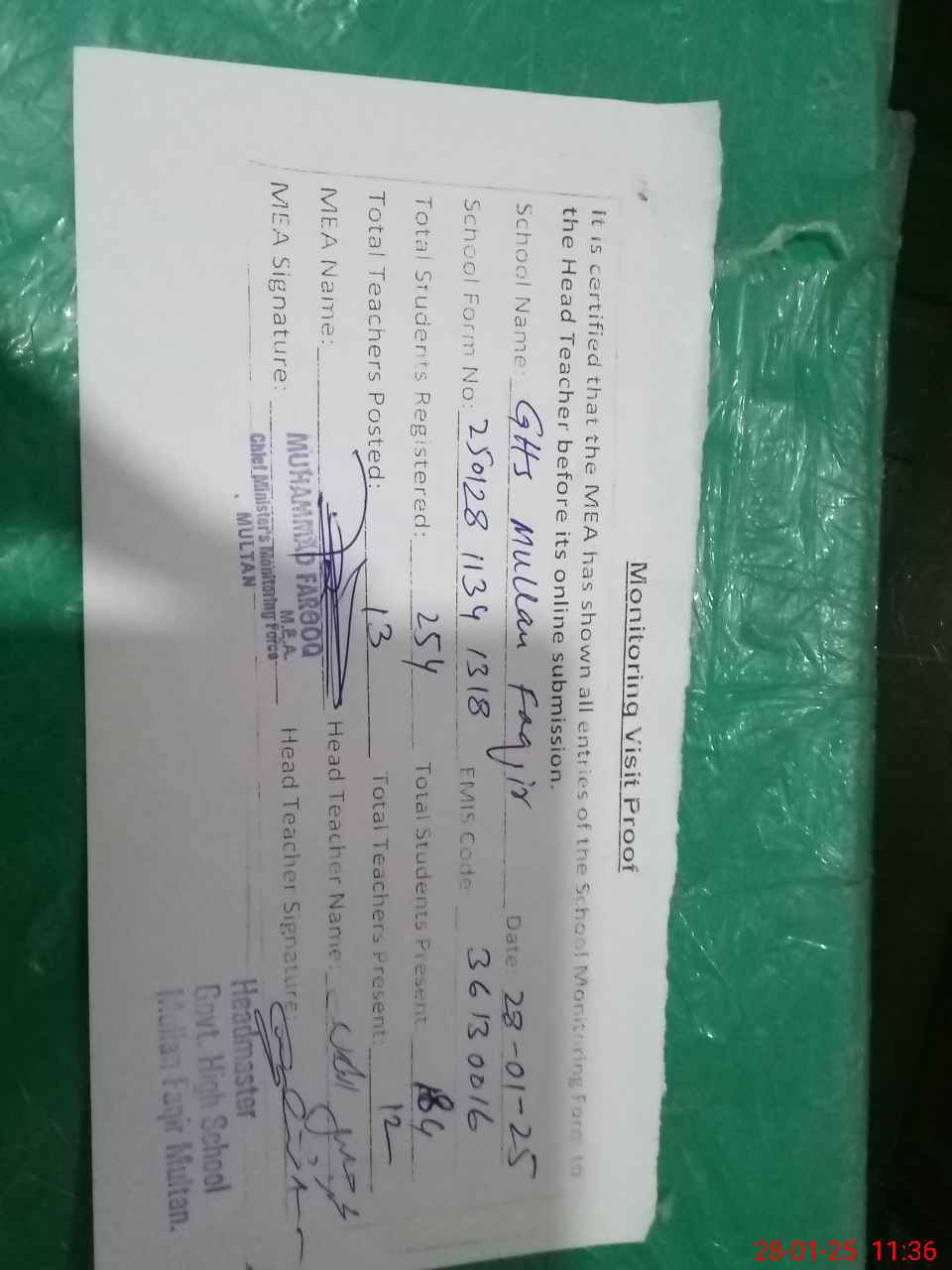 | EMIS Code: 36130016 | Name of School: GHS MULLAN FAQIR BUDHLA MULTAN | |||