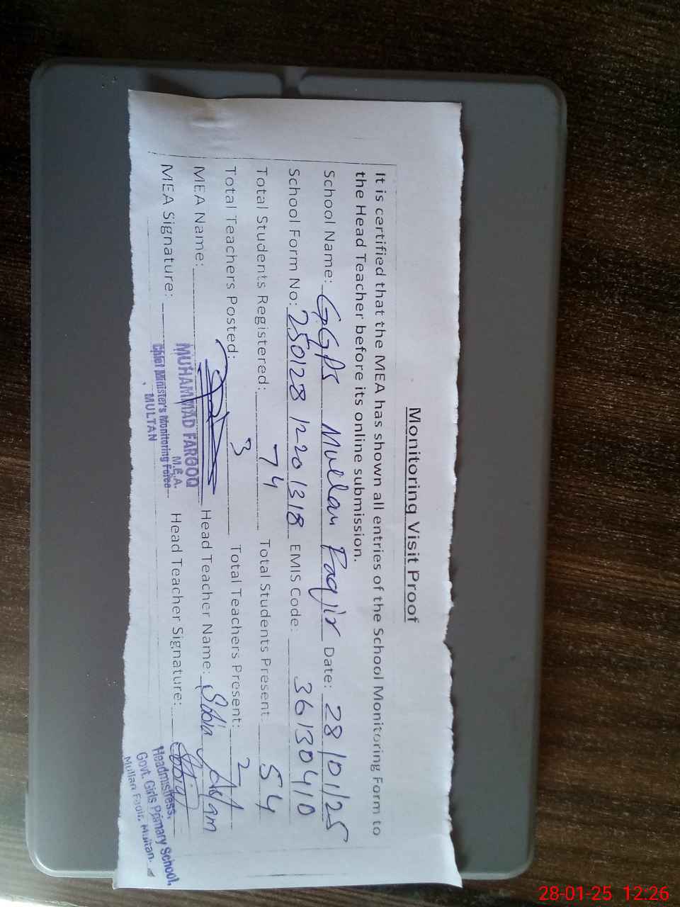 | EMIS Code: 36130410 | Name of School: GGPS MULAN FAQIR MULTAN | |||