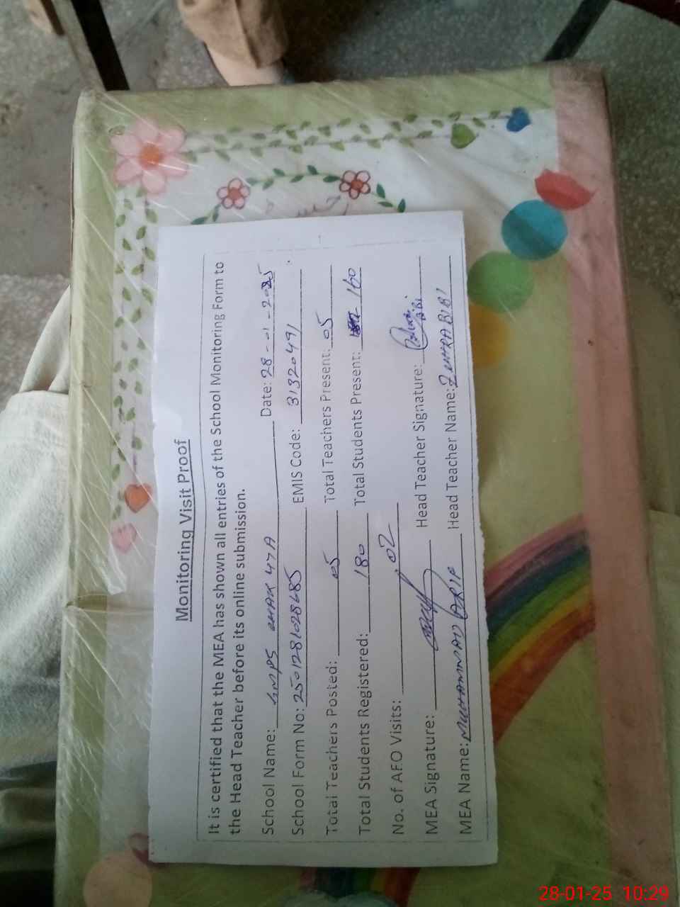 | Attendance Register | Head Teacher | MEA with School | Visit Proof |