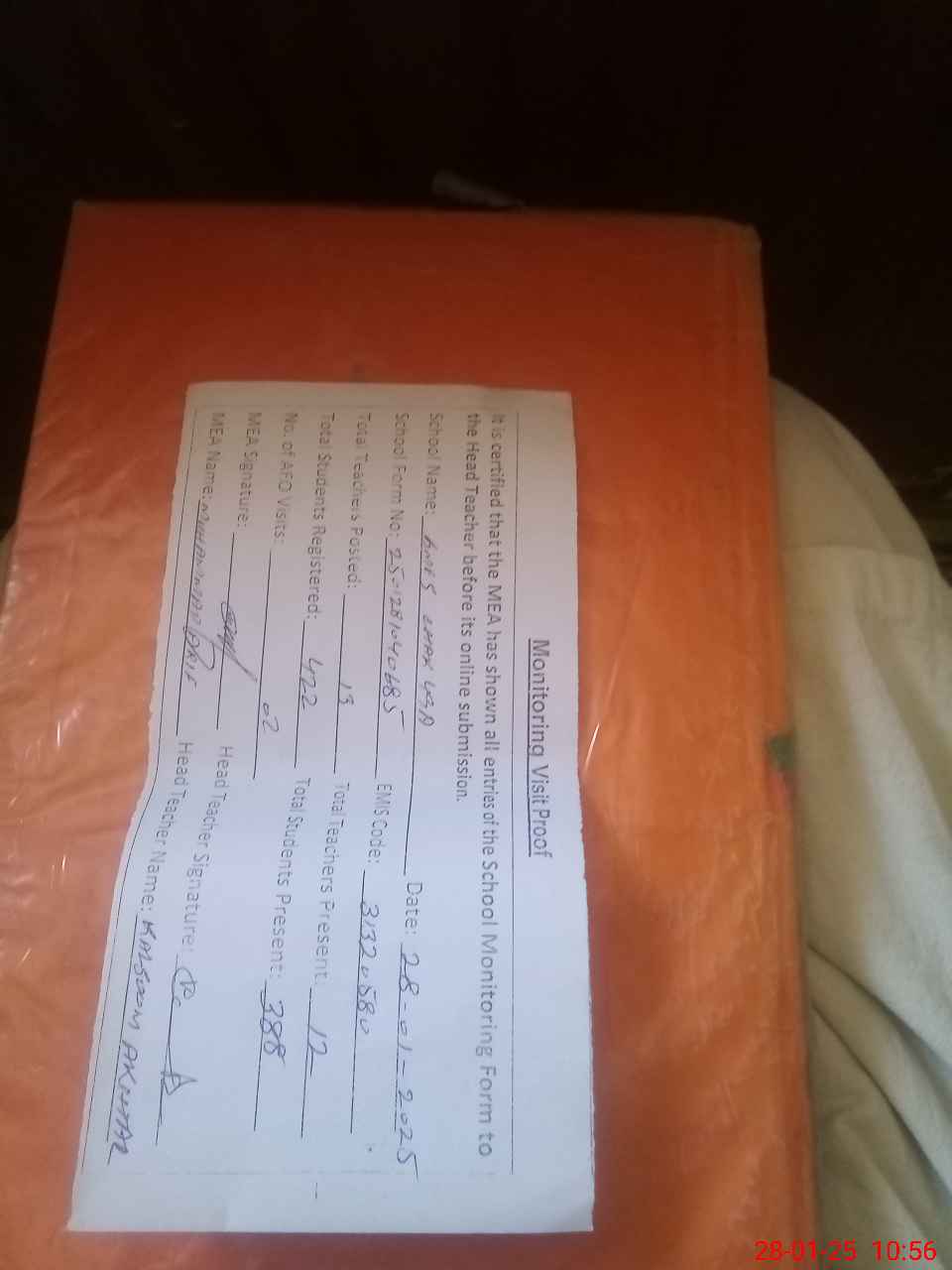 | Attendance Register | Head Teacher | MEA with School | Visit Proof |