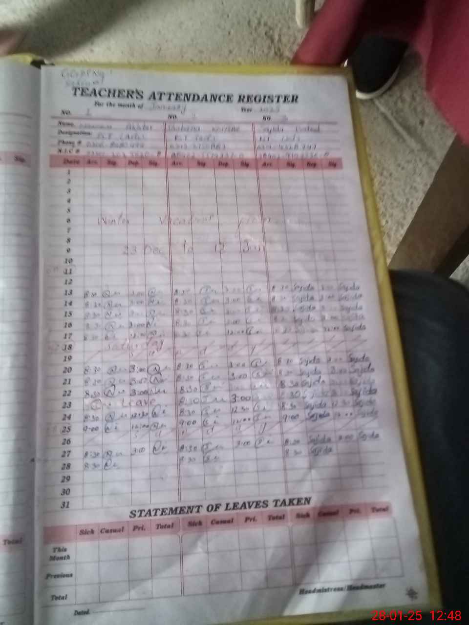 | CNIC | Full Name | Designation | R/C | Absence During Last Calender Month |