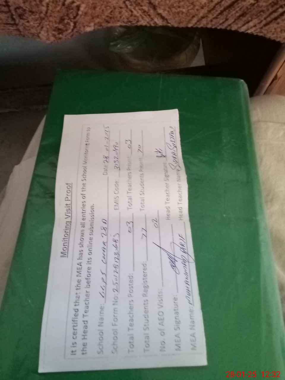 | Attendance Register | Head Teacher | MEA with School | Visit Proof |