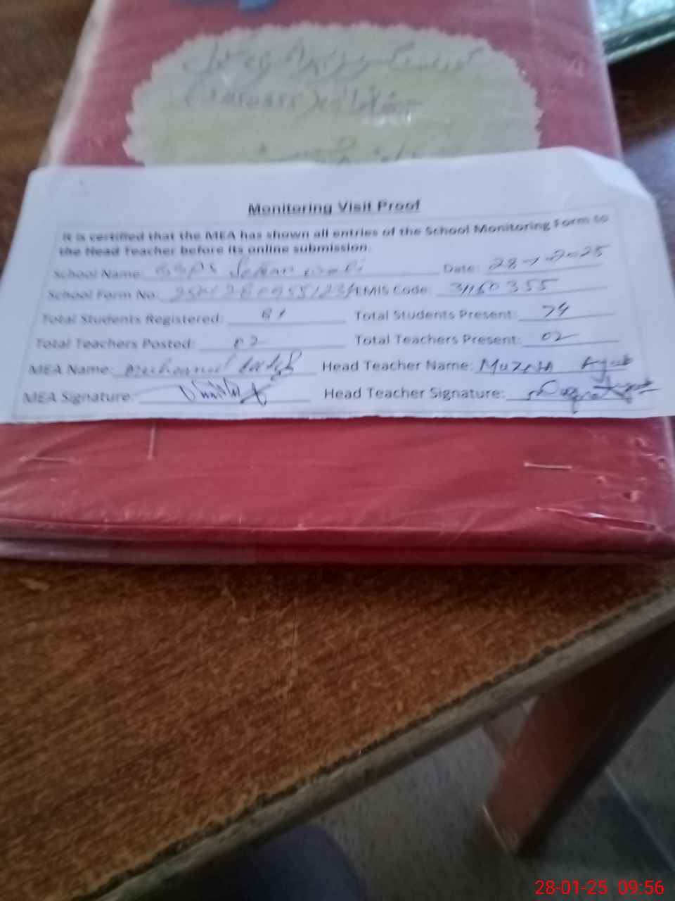 | Attendance Register | Head Teacher | MEA with School | Visit Proof |