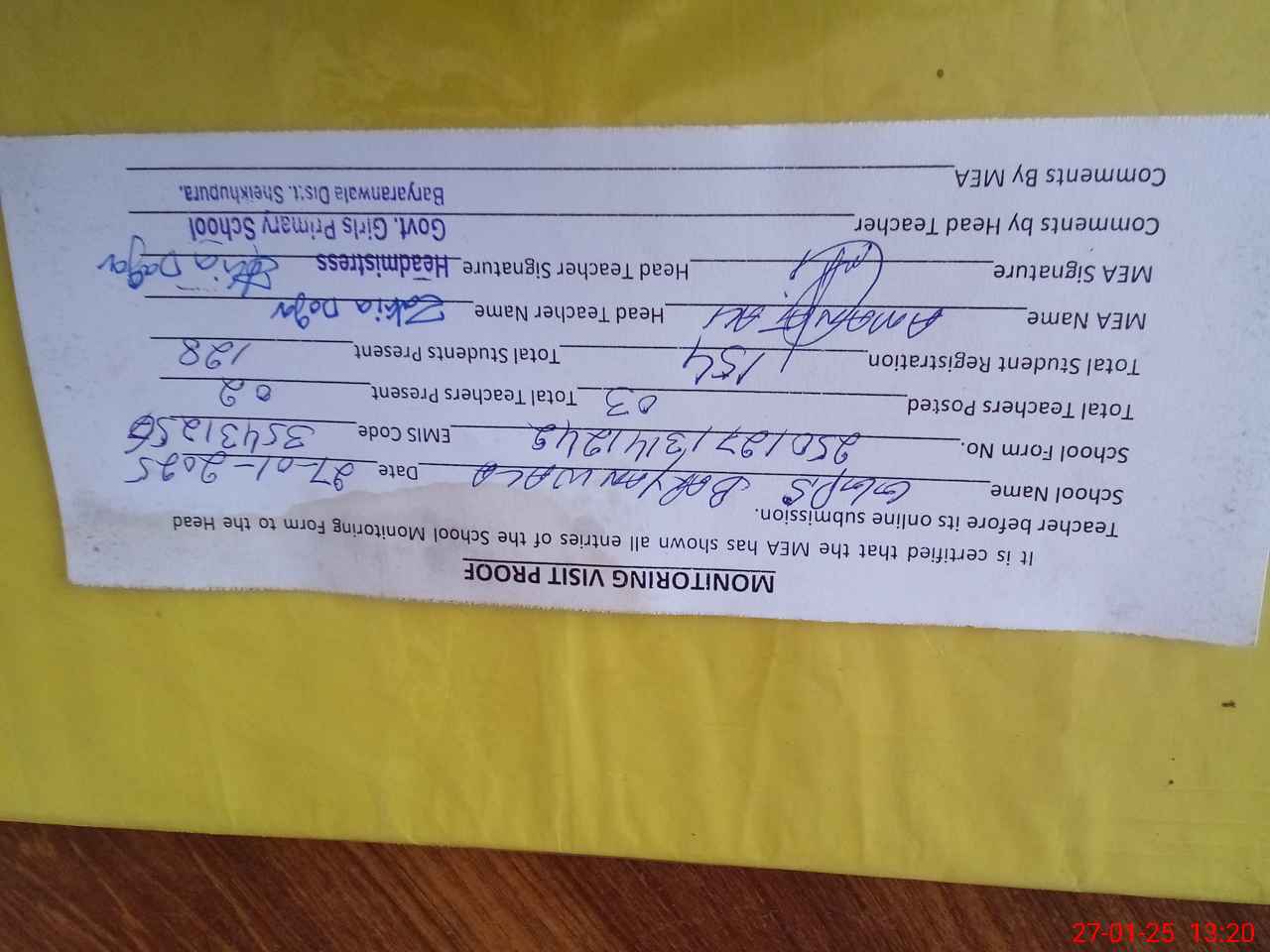 | Attendance Register | Head Teacher | MEA with School | Visit Proof |