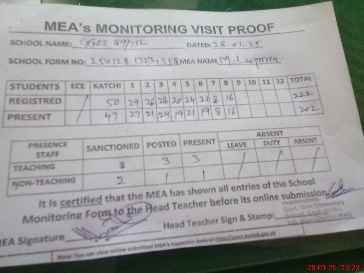 | Attendance Register | Head Teacher | MEA with School | Visit Proof |