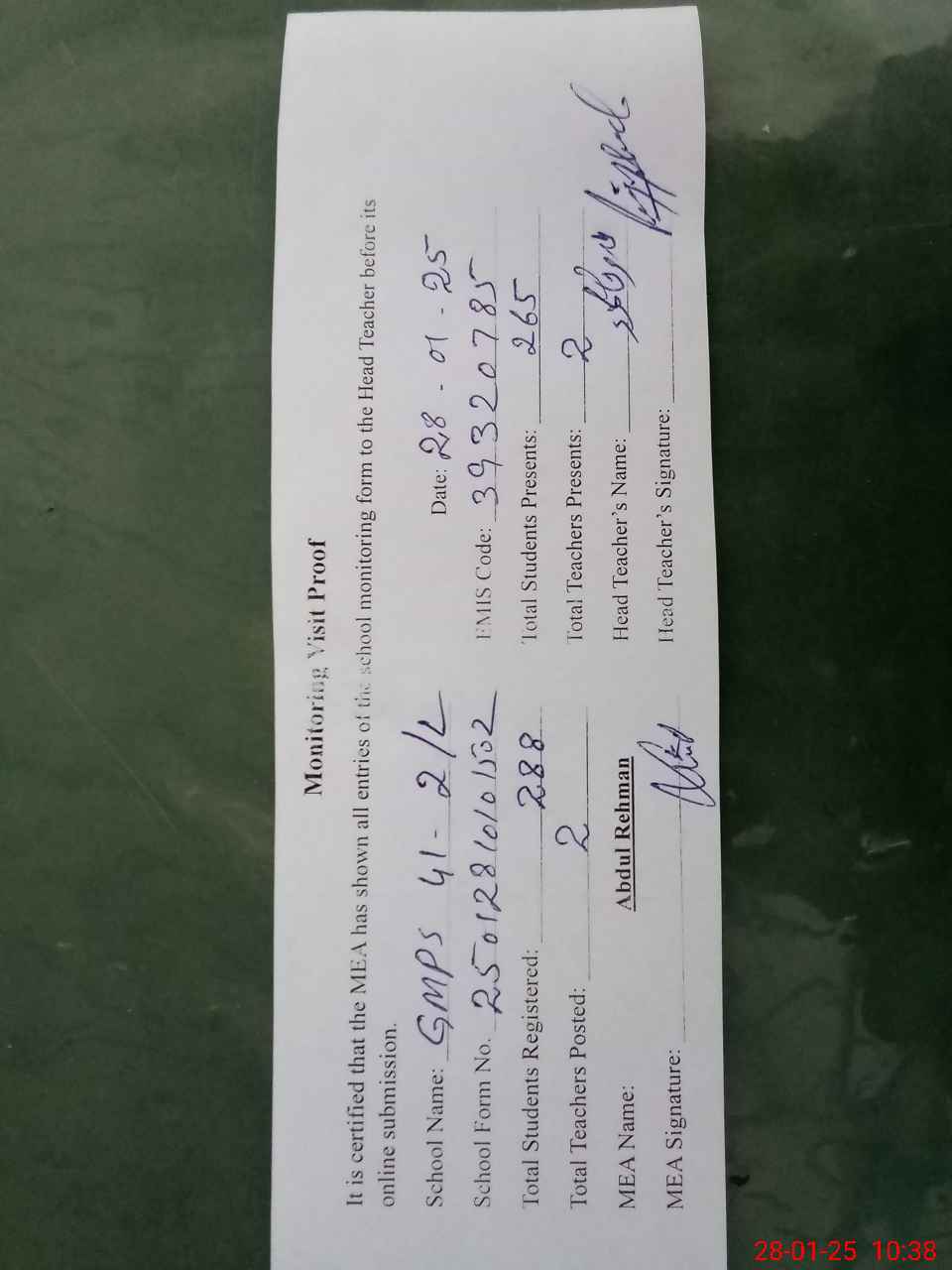 | Attendance Register | Head Teacher | MEA with School | Visit Proof |