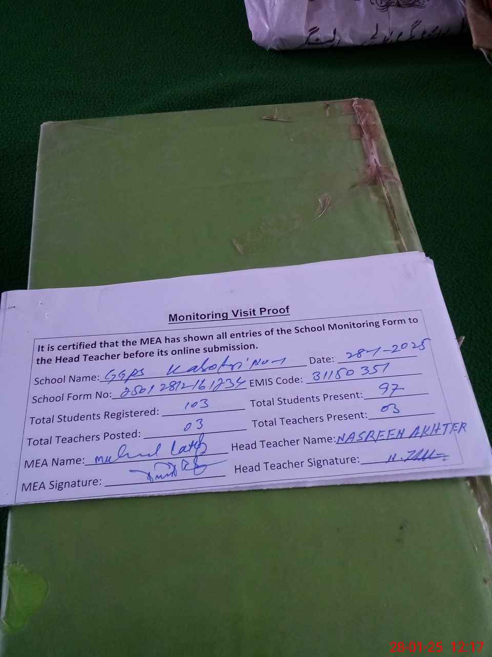 | Attendance Register | Head Teacher | MEA with School | Visit Proof |