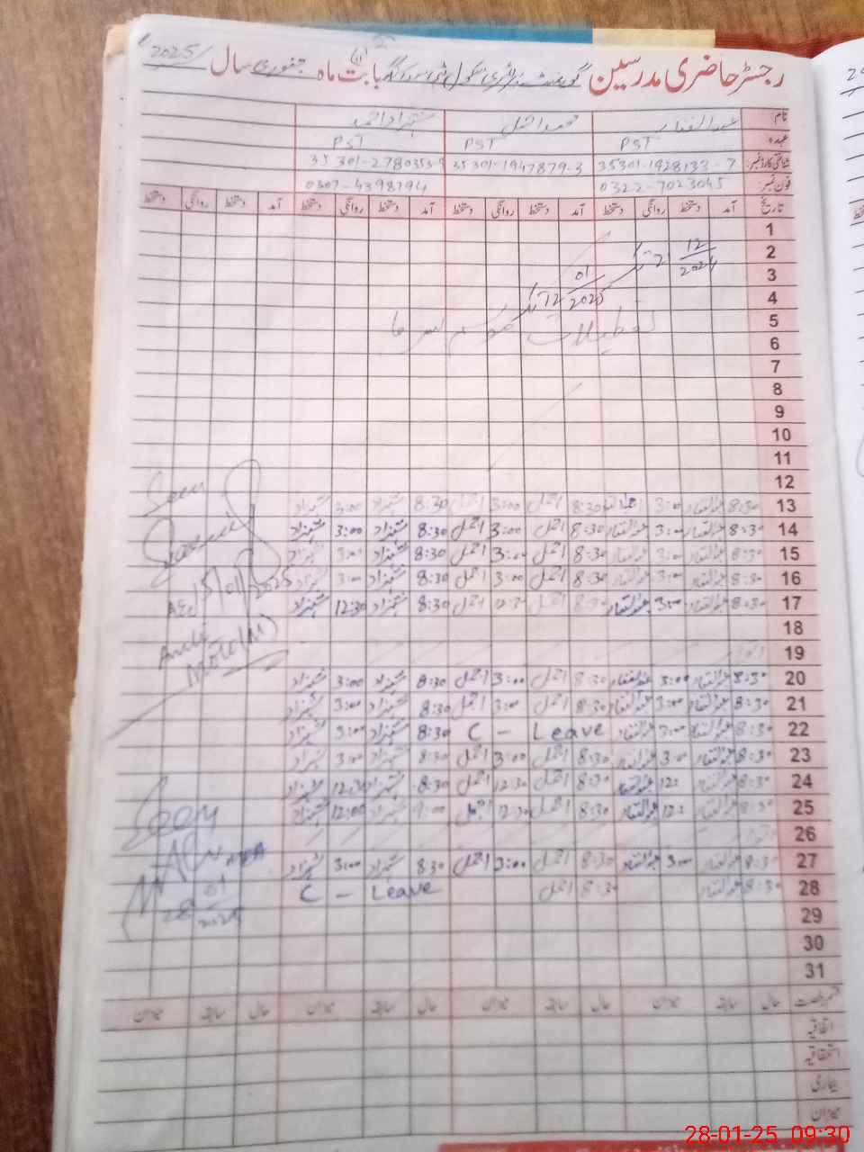 | CNIC | Full Name | Designation | R/C | Absence During Last Calender Month |
