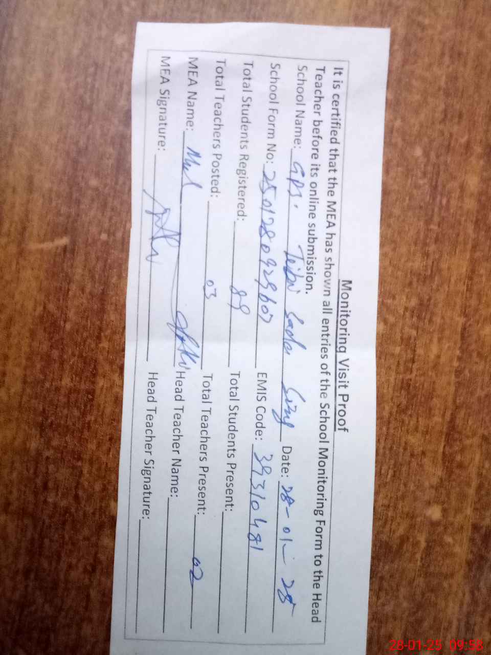 | Attendance Register | Head Teacher | MEA with School | Visit Proof |
