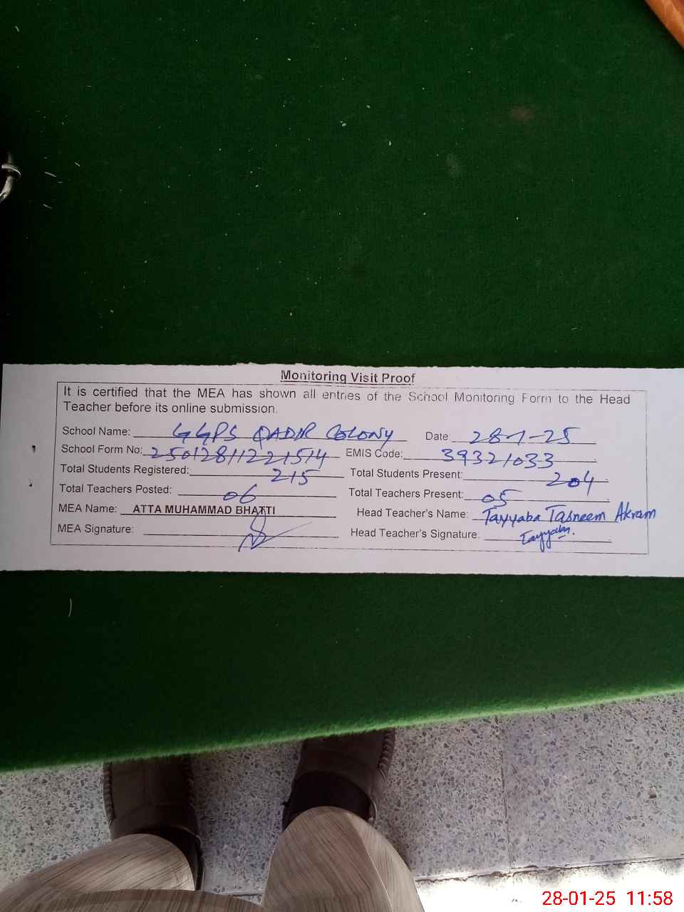 | EMIS Code: 39321033 | Name of School: GGPS QADIR COLONY | |||