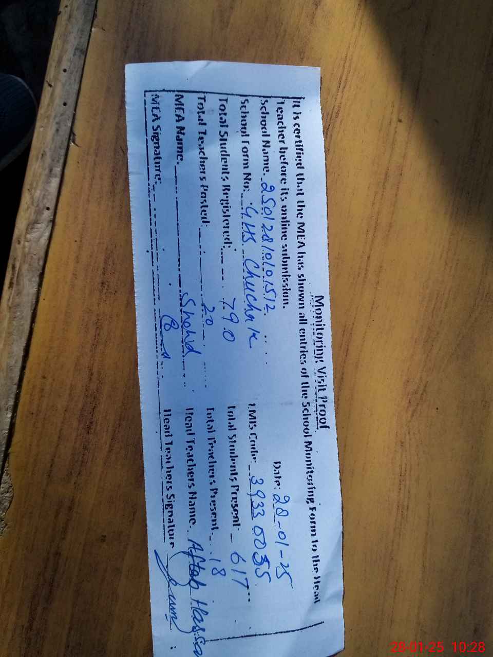 | Attendance Register | Head Teacher | MEA with School | Visit Proof |