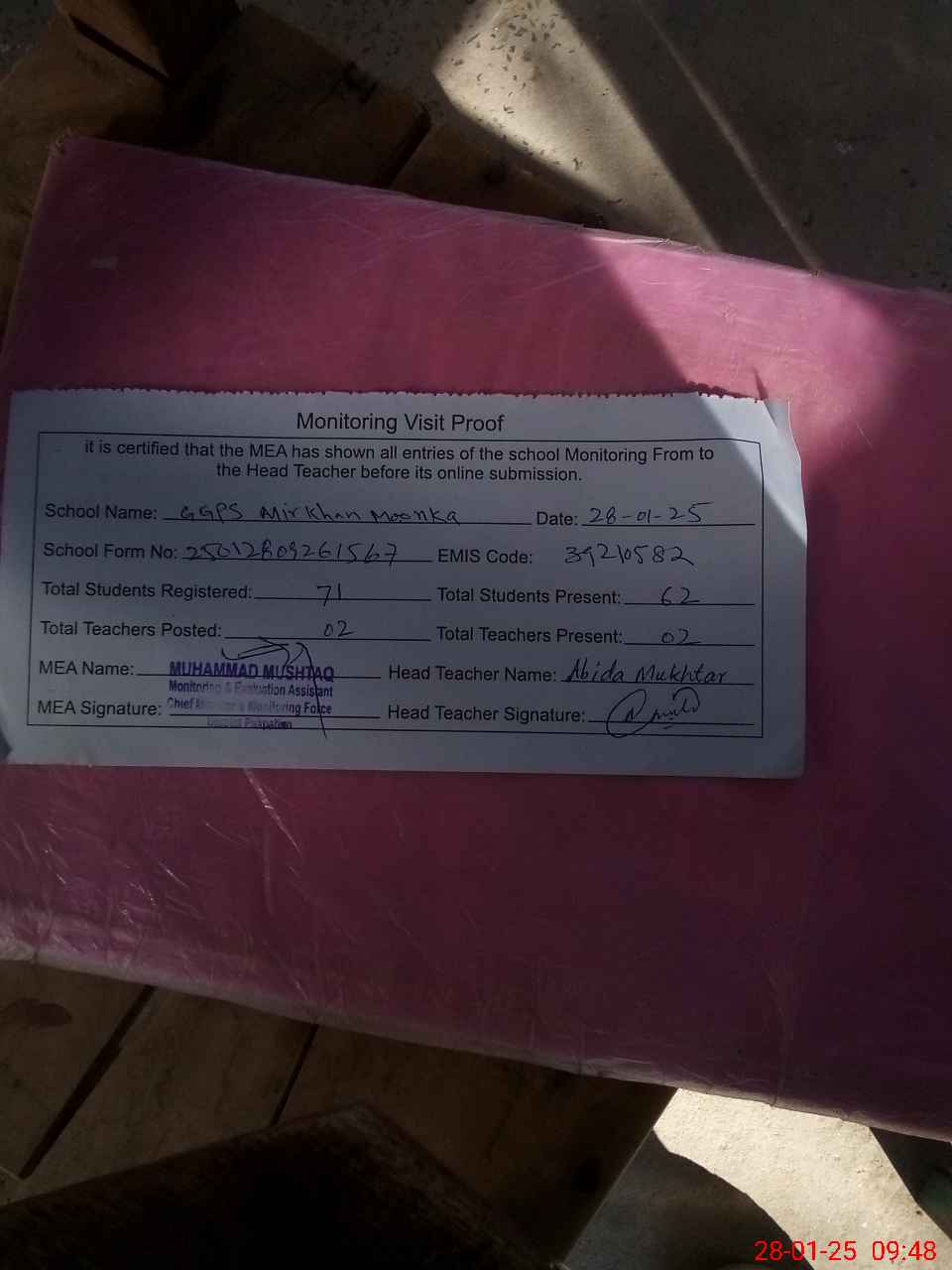 | Attendance Register | Head Teacher | MEA with School | Visit Proof |