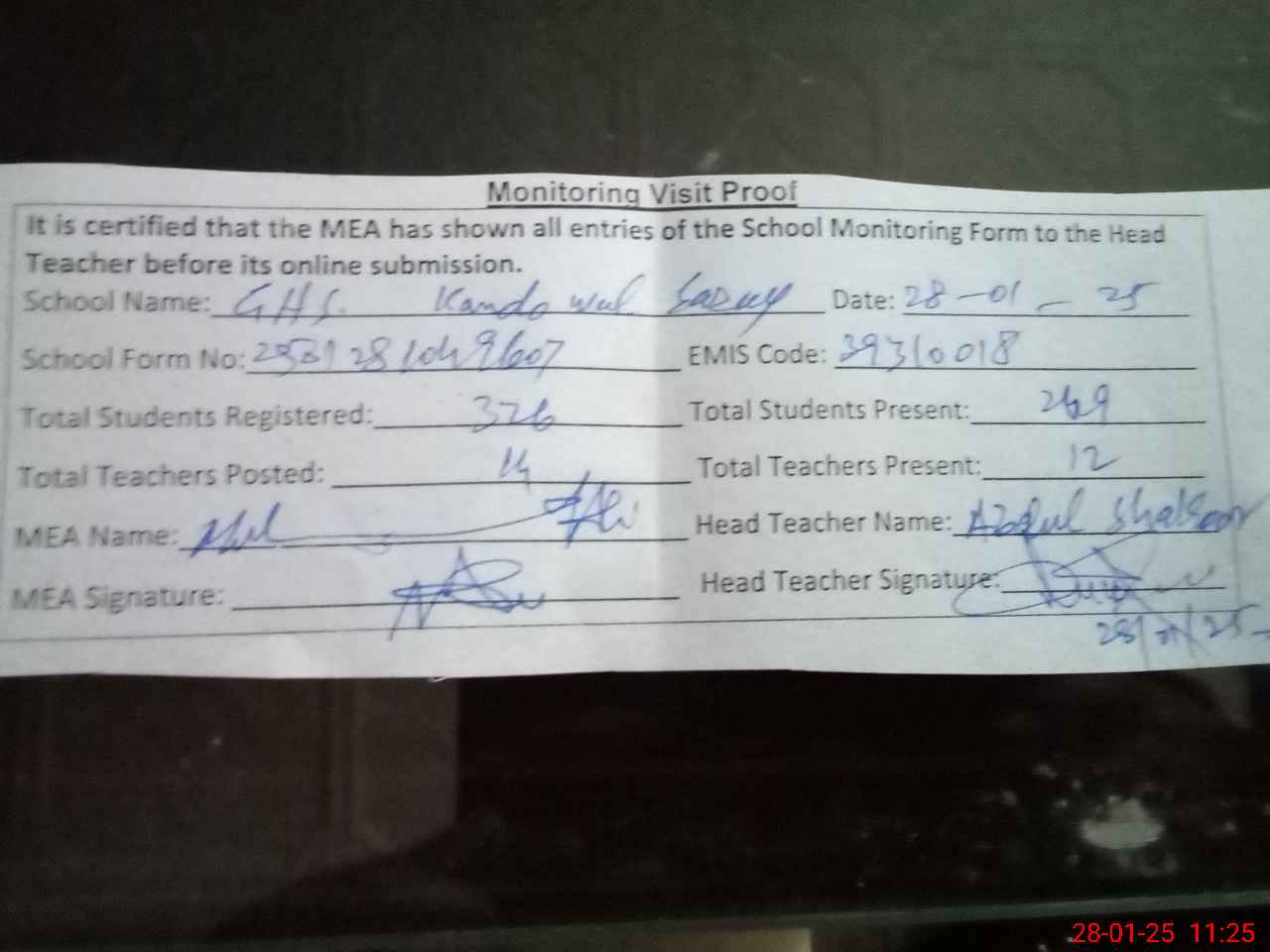 | Attendance Register | Head Teacher | MEA with School | Visit Proof |