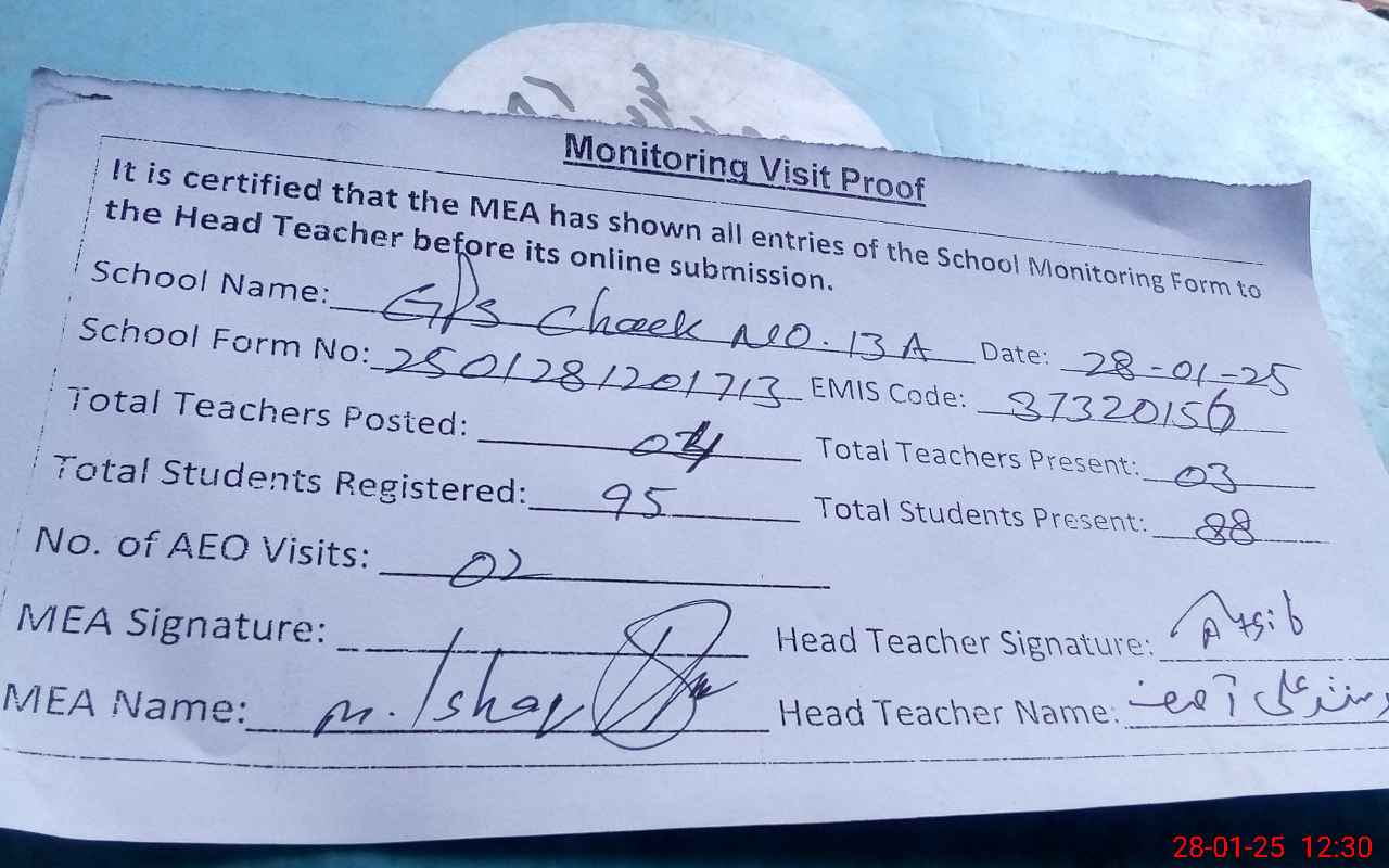 | EMIS Code: 31320156 | Name of School: GPS CHAK NO. 13/A | |||