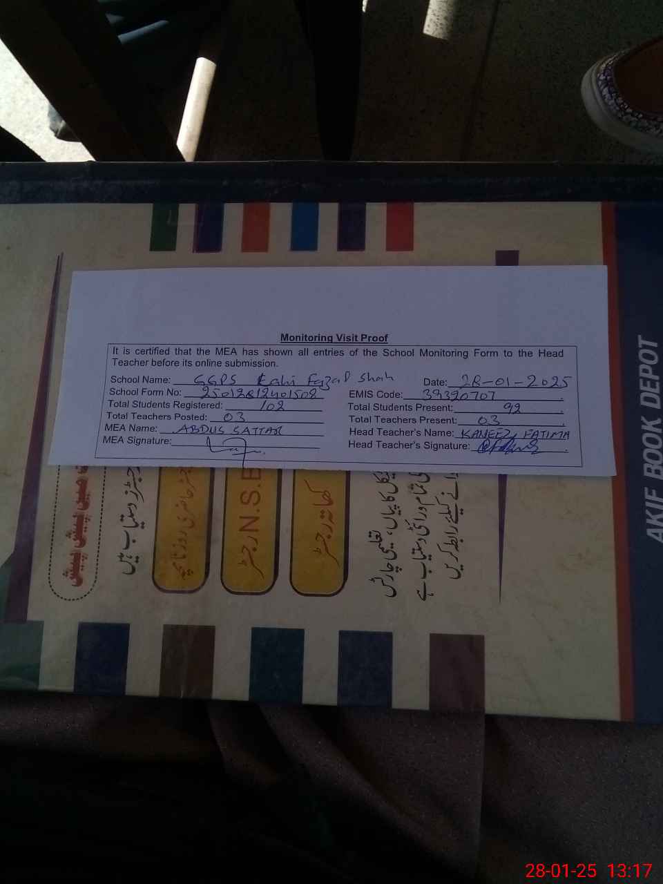 | Attendance Register | Head Teacher | MEA with School | Visit Proof |