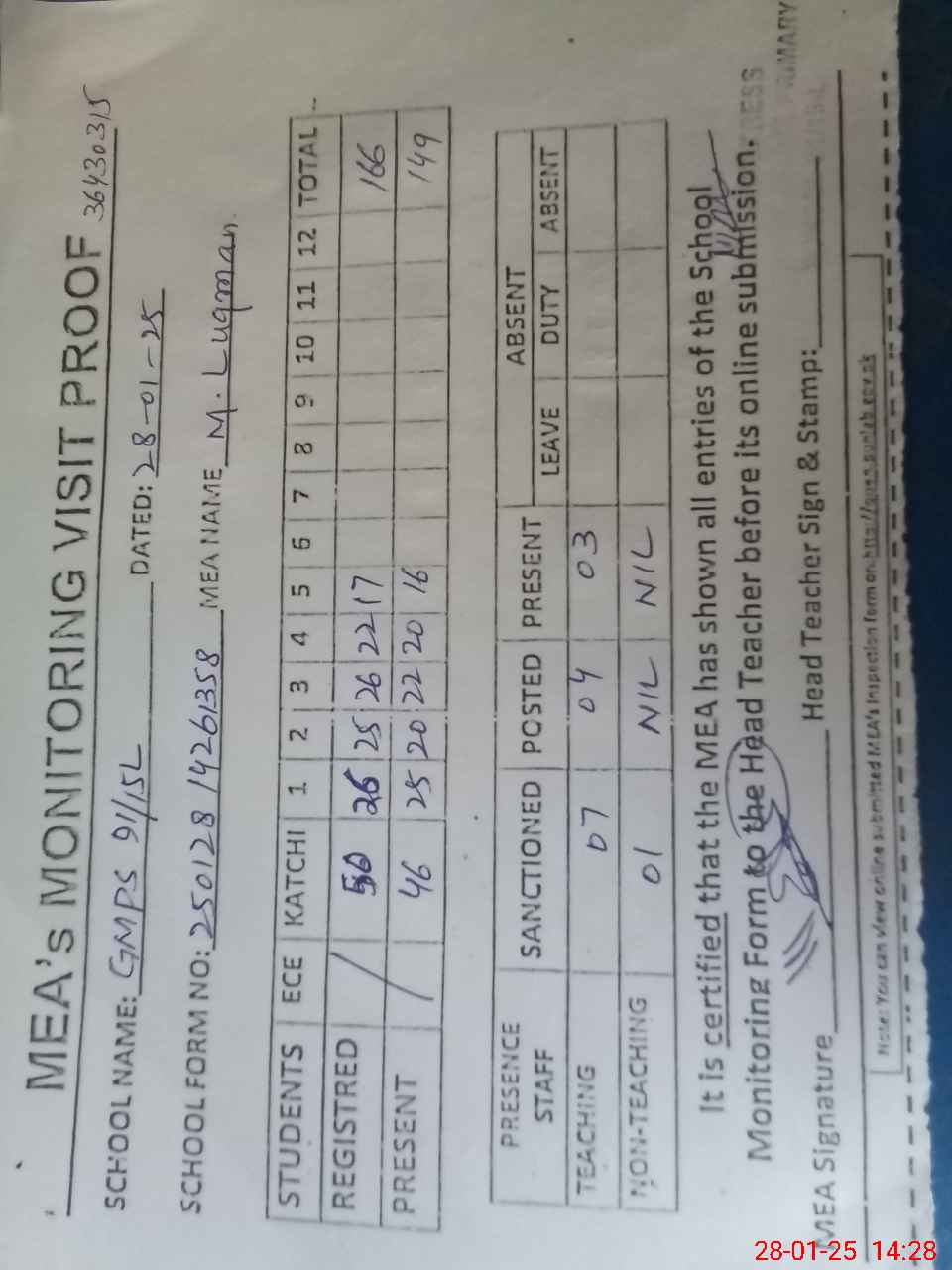 | Attendance Register | Head Teacher | MEA with School | Visit Proof |