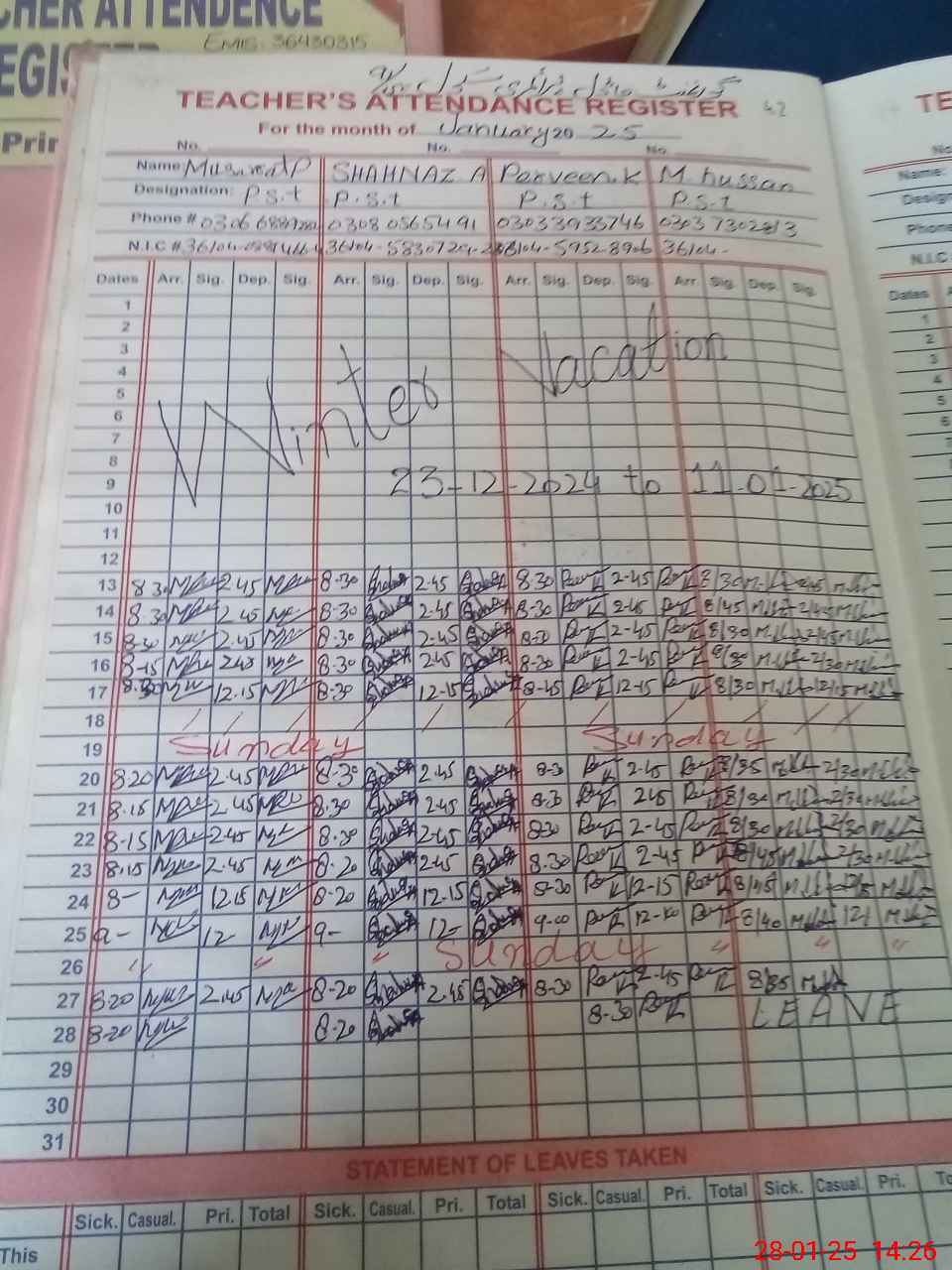 | CNIC | Full Name | Designation | R/C | Absence During Last Calender Month |