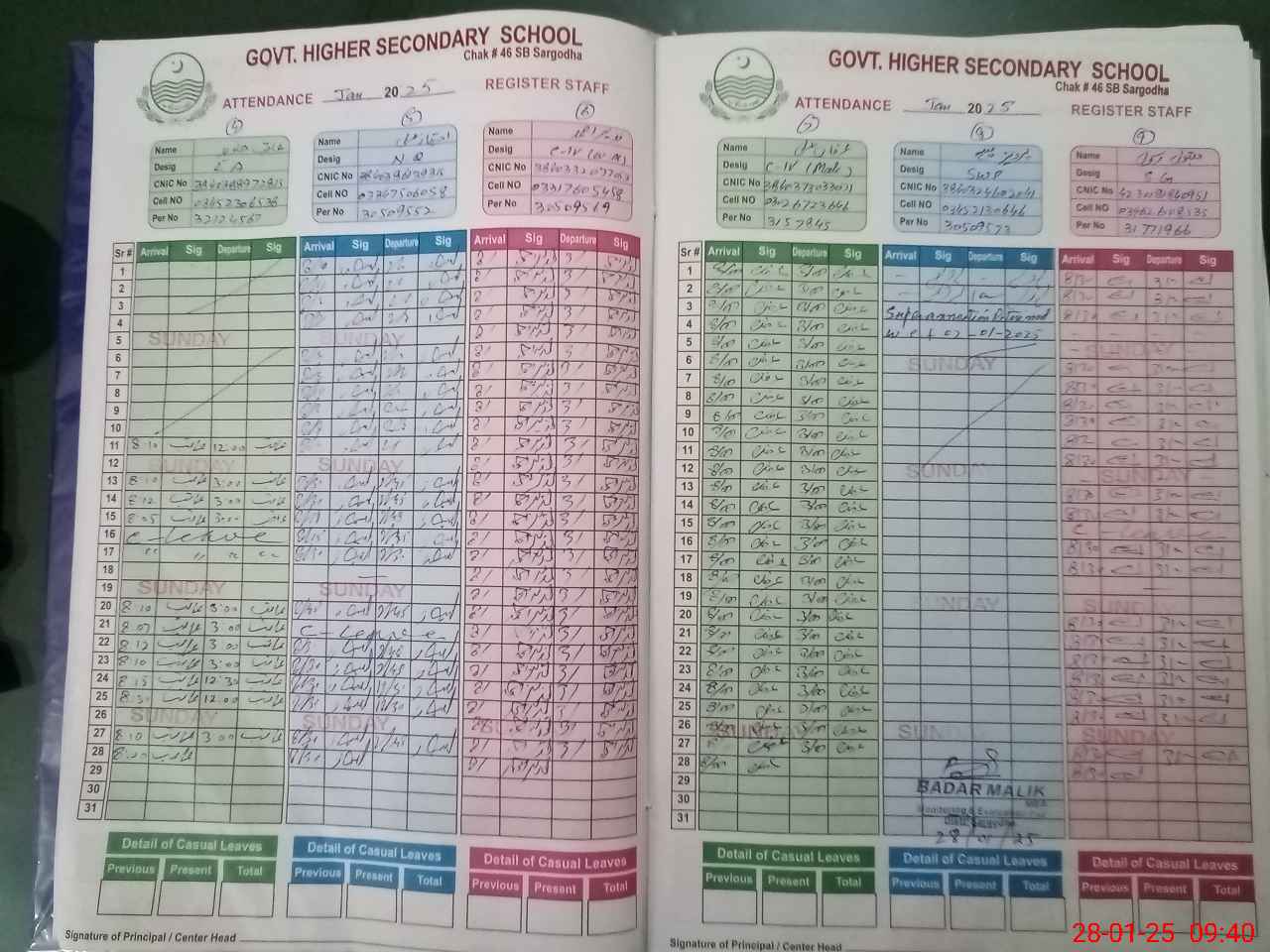| CNIC | Full Name | Designation | R/C | Absence during last cal. month |
