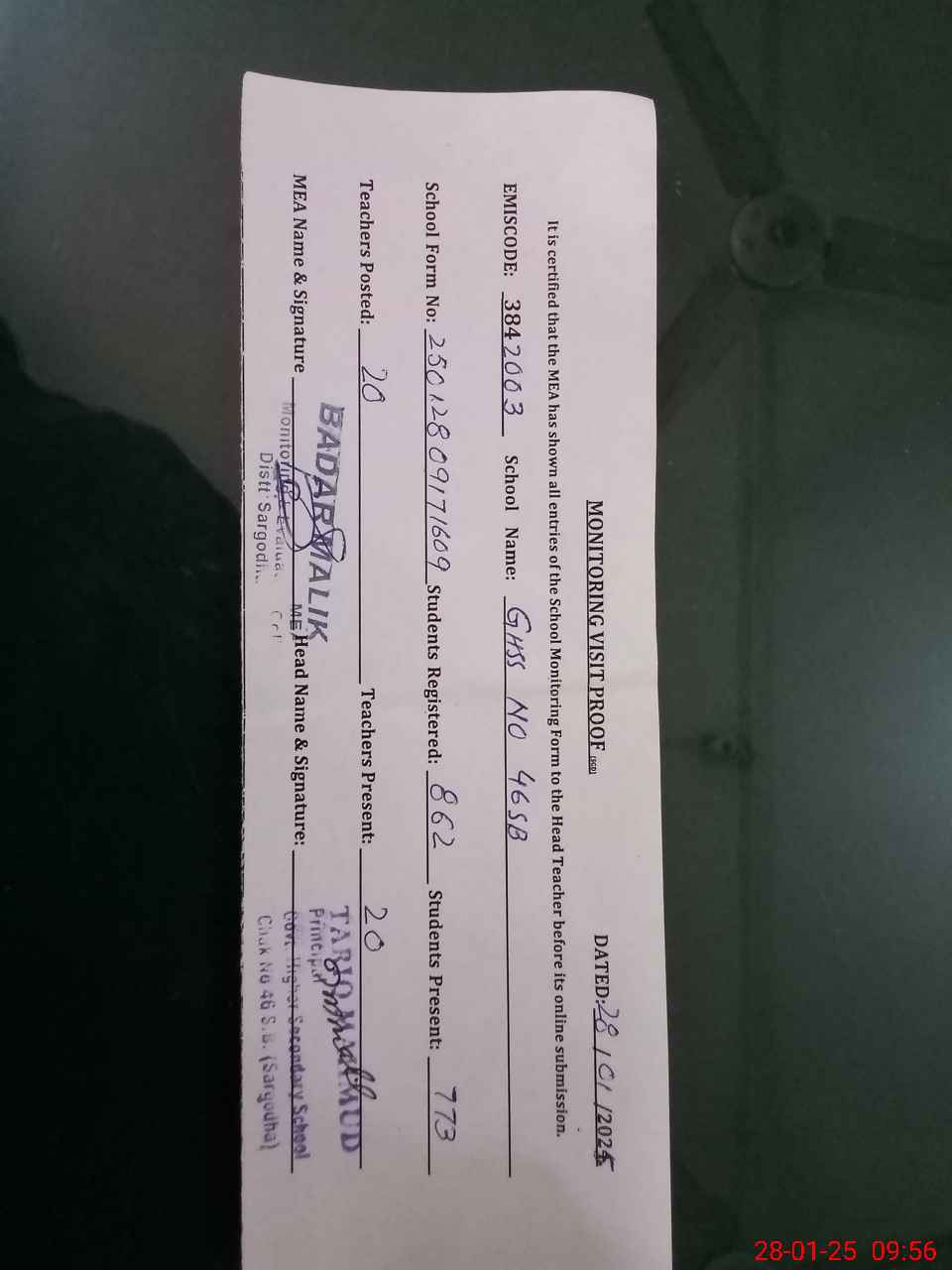| Attendance Register | Head Teacher | MEA with School | Visit Proof |