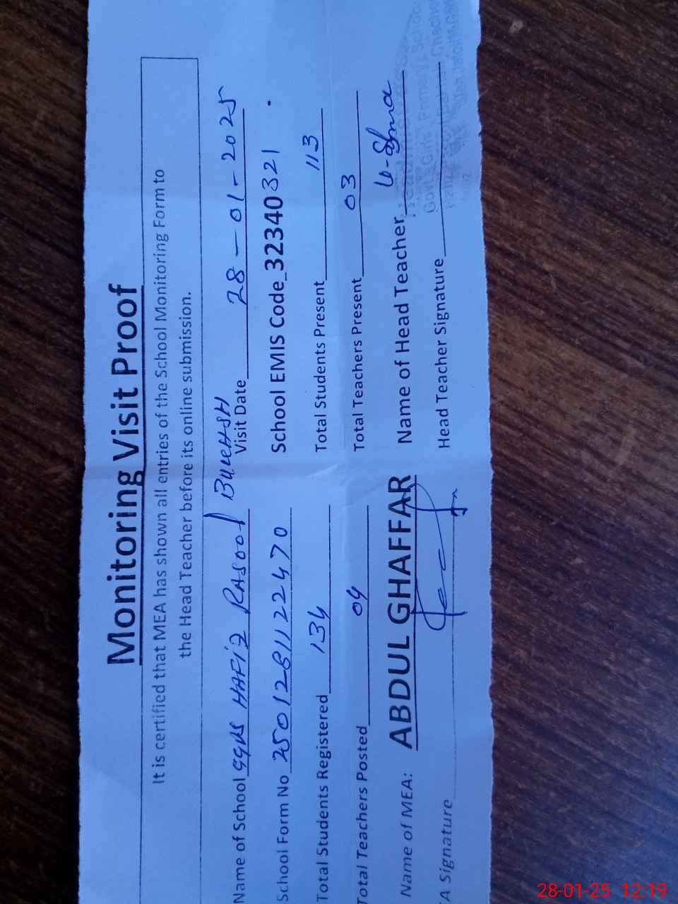 | Attendance Register | Head Teacher | MEA with School | Visit Proof |