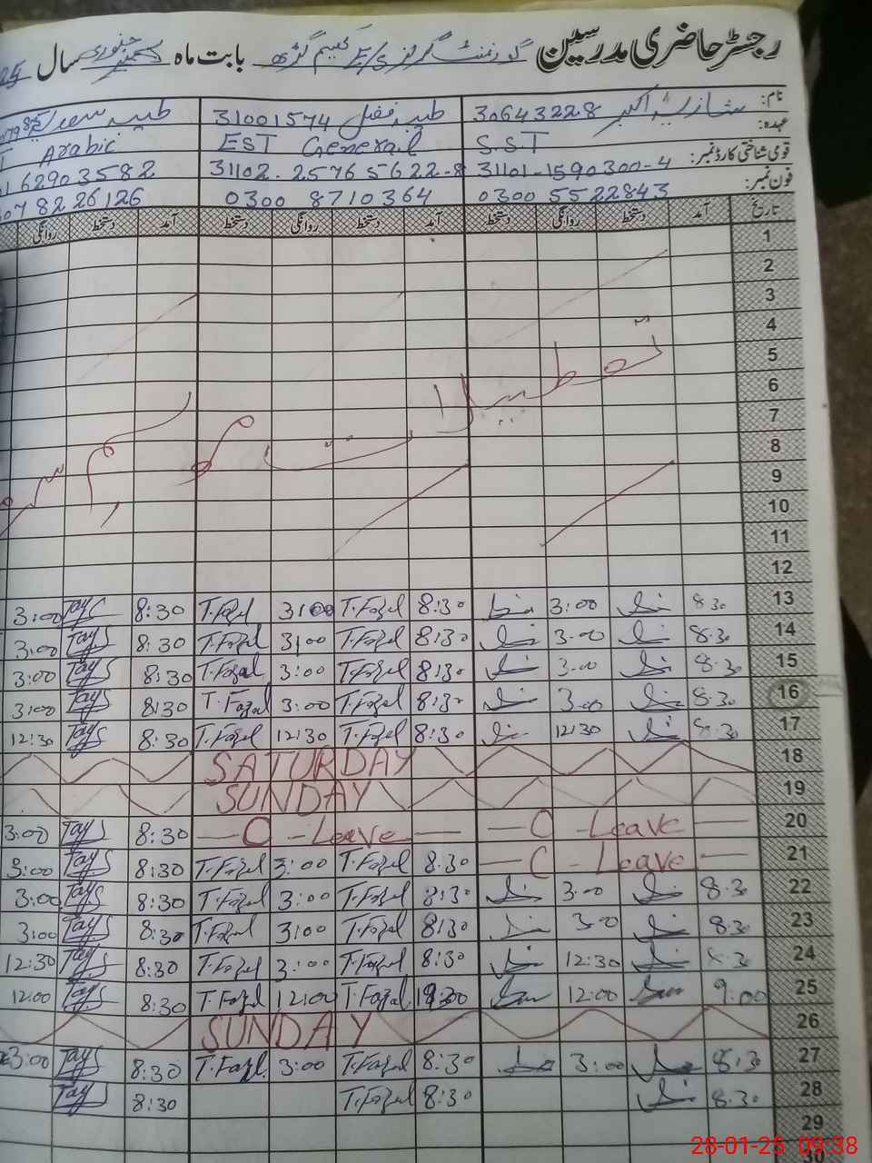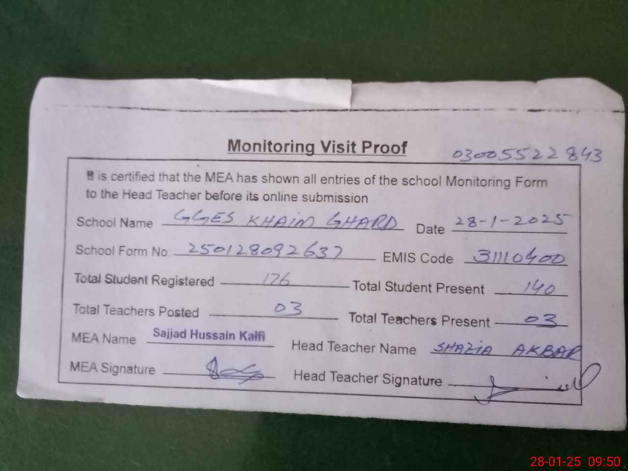 | Name: SH**** AK**** Designation: (School Headmaster's/Headmistress's) SST( G) Phone/Cell Number: 03**** |