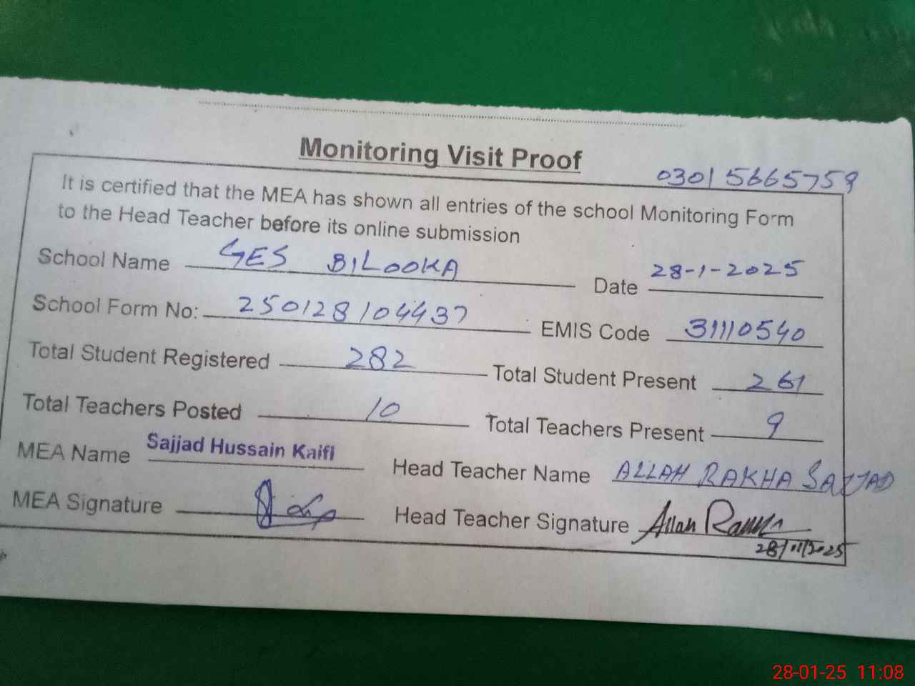 | Attendance Register | Head Teacher | MEA with School | Visit Proof |