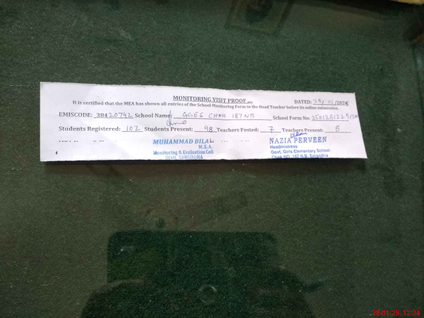 | Attendance Register | Head Teacher | MEA with School | Visit Proof |