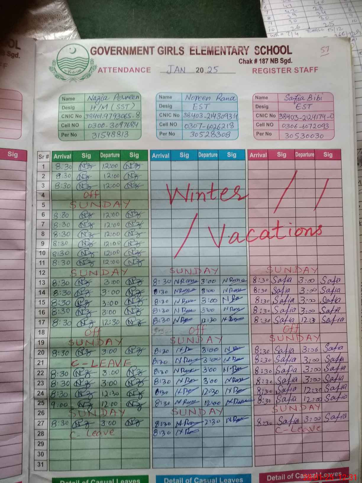 | CNIC | Full Name | Designation | R/C | Absence During Last Calender Month |