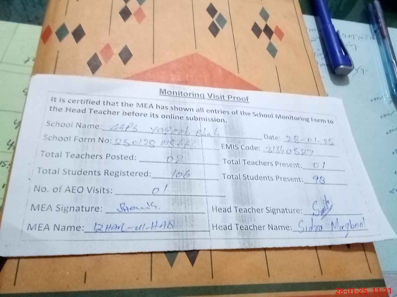 | Attendance Register | Head Teacher | MEA with School | Visit Proof |