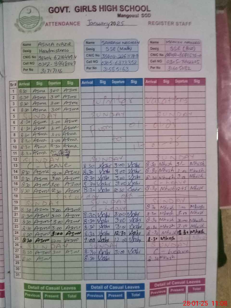 | CNIC | Full Name | Designation | R/C | Absence during last cal. month |