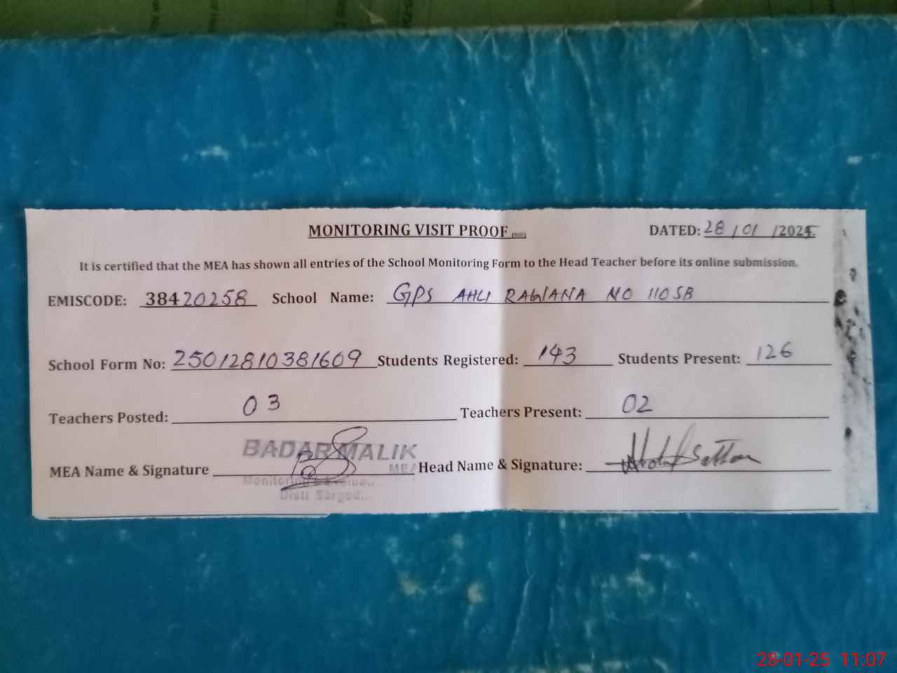 | EMIS Code: 38420258 | Name of School: GPS AHLI RAWAN CHAK NO. 110 SB | |||