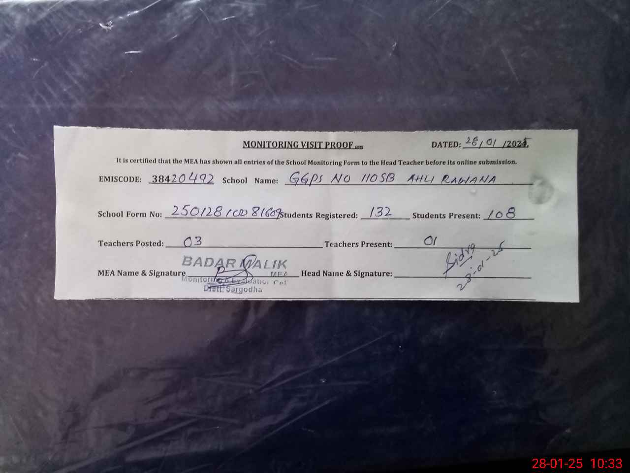 | Attendance Register | Head Teacher | MEA with School | Visit Proof |