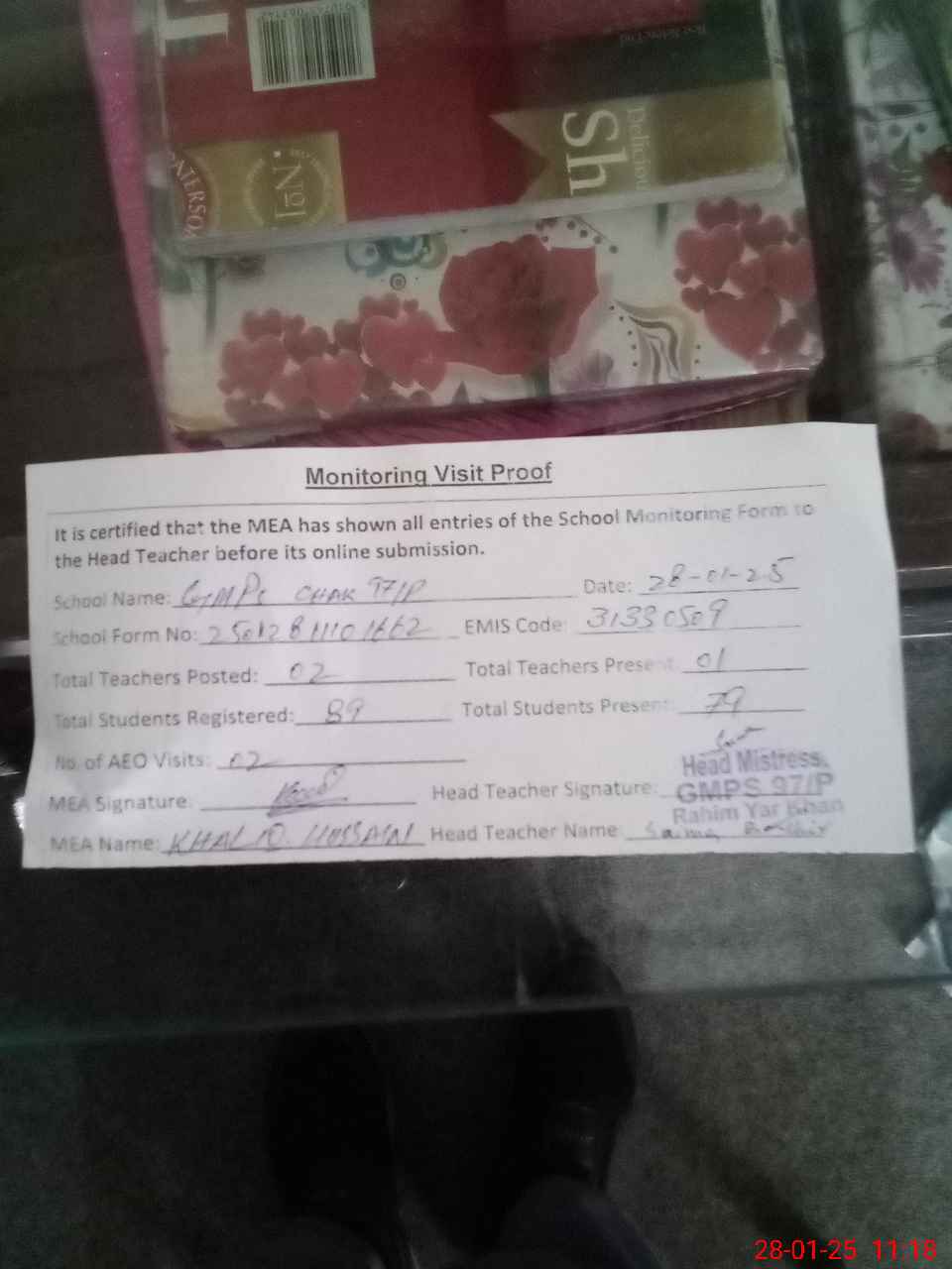 | Attendance Register | Head Teacher | MEA with School | Visit Proof |