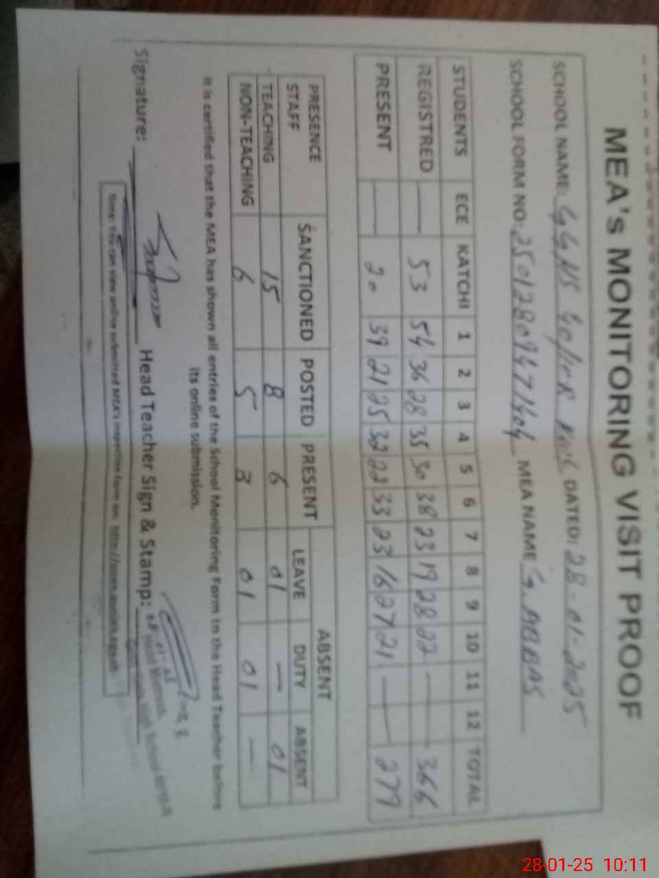 | Attendance Register | Head Teacher | MEA with School | Visit Proof |