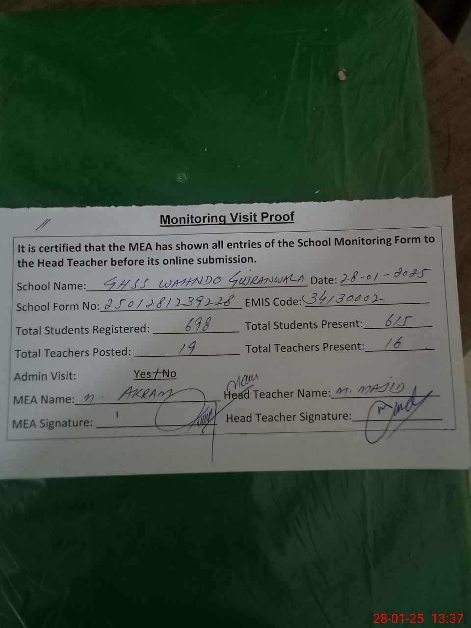 | Attendance Register | Head Teacher | MEA with School | Visit Proof |