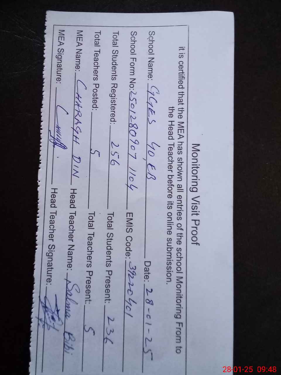 | Attendance Register | Head Teacher | MEA with School | Visit Proof |