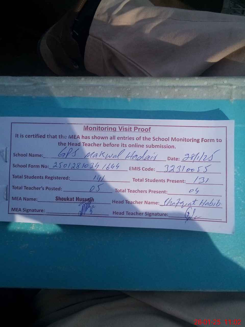 | Attendance Register | Head Teacher | MEA with School | Visit Proof |
