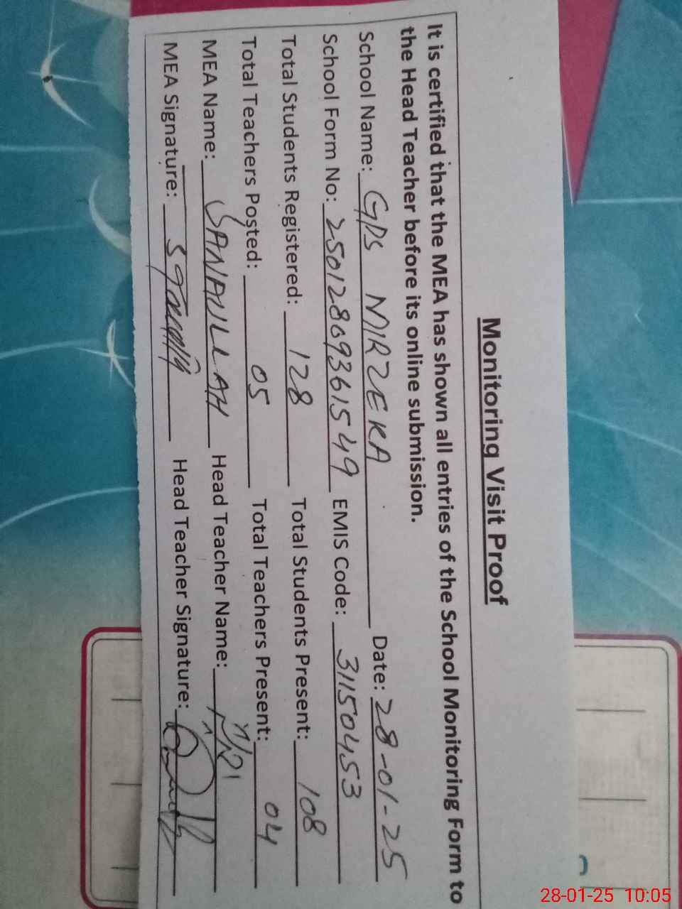 | Attendance Register | Head Teacher | MEA with School | Visit Proof |