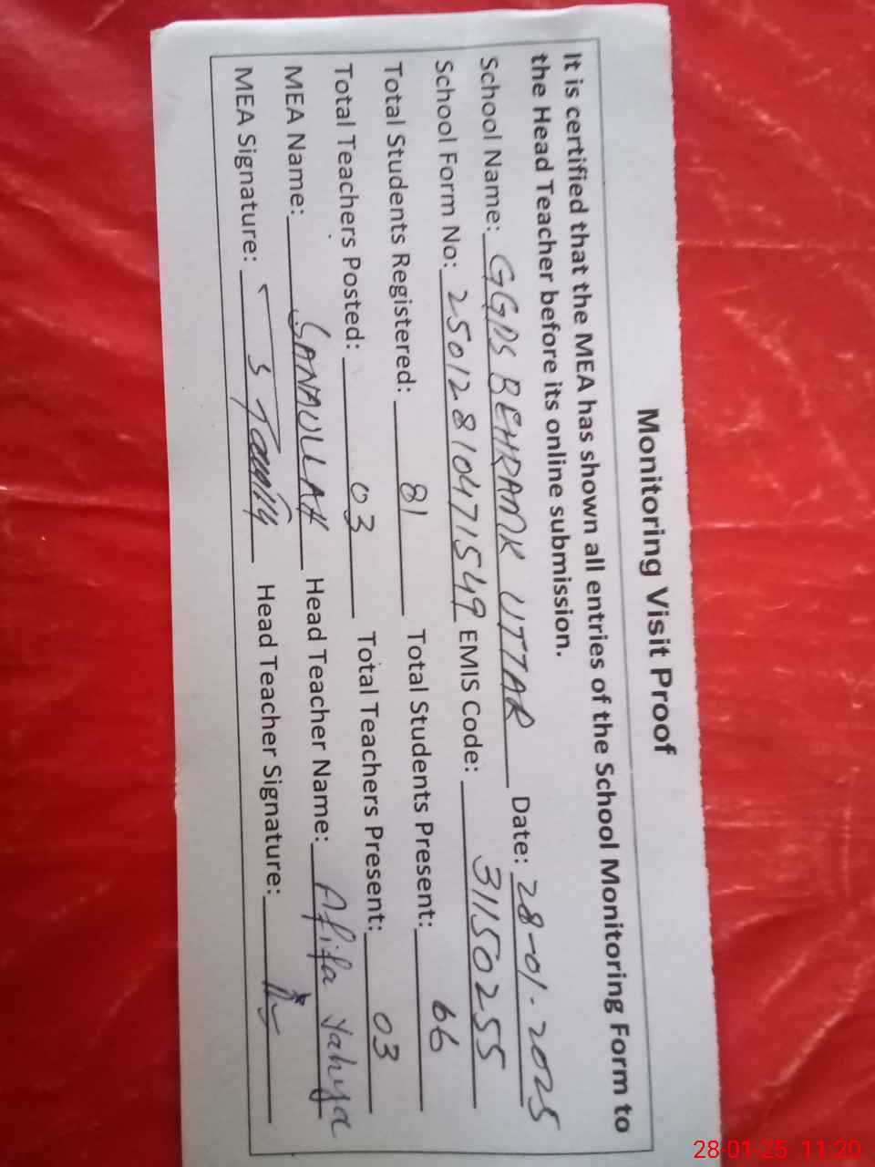 | Attendance Register | Head Teacher | MEA with School | Visit Proof |