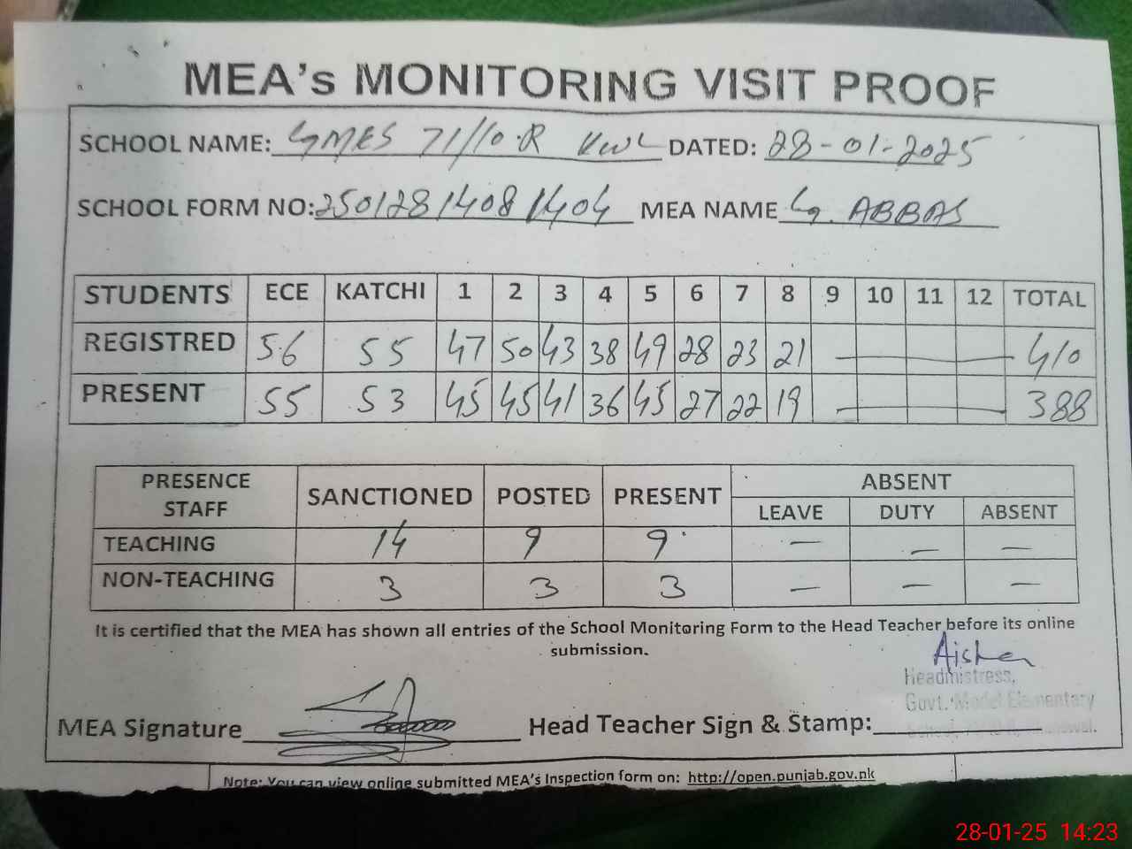 | Attendance Register | Head Teacher | MEA with School | Visit Proof |