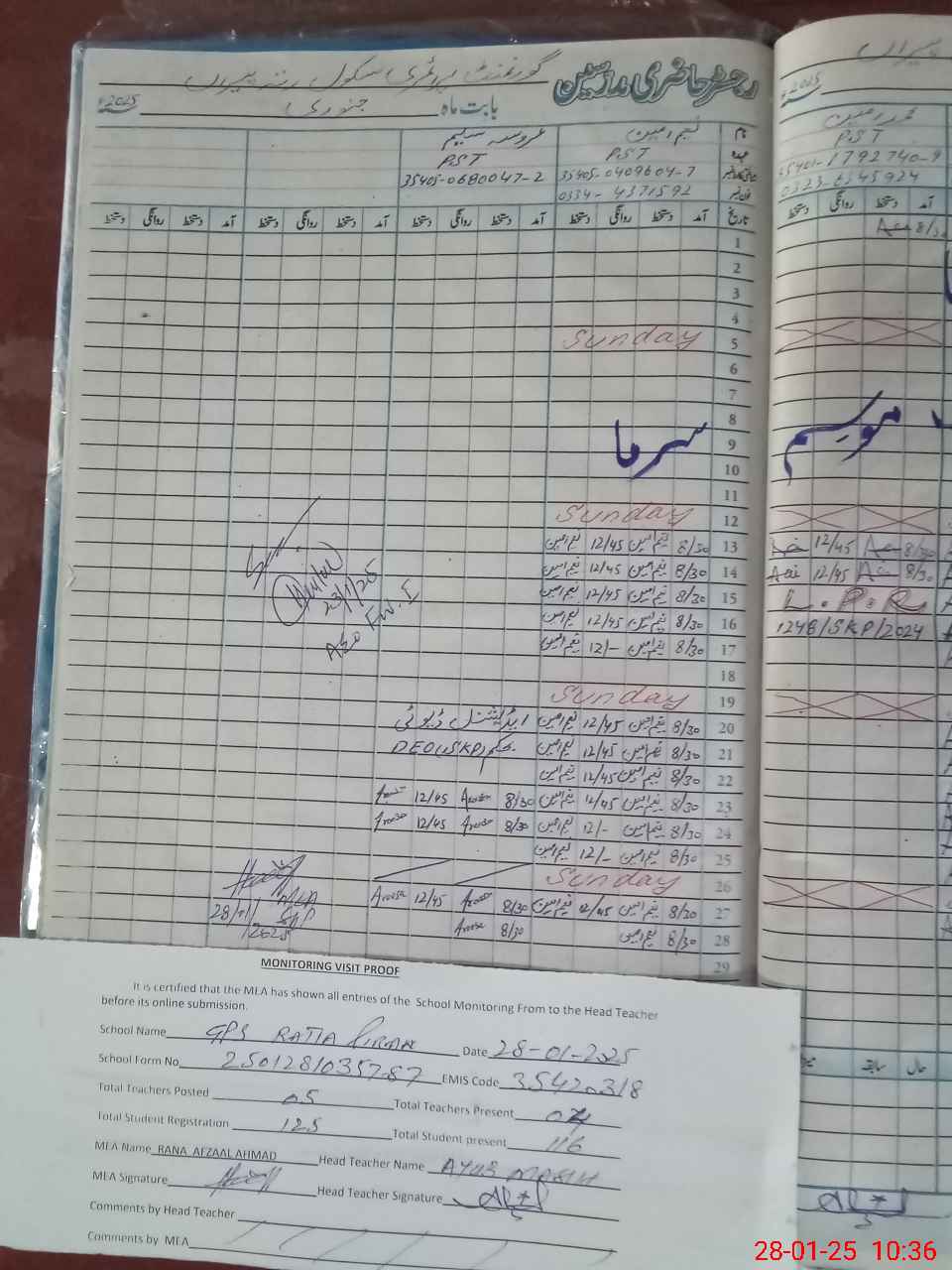 | Attendance Register | Head Teacher | MEA with School | Visit Proof |