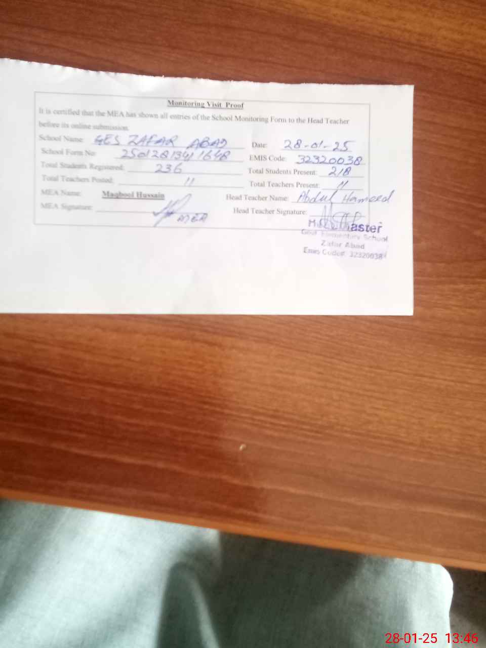 | Attendance Register | Head Teacher | MEA with School | Visit Proof |