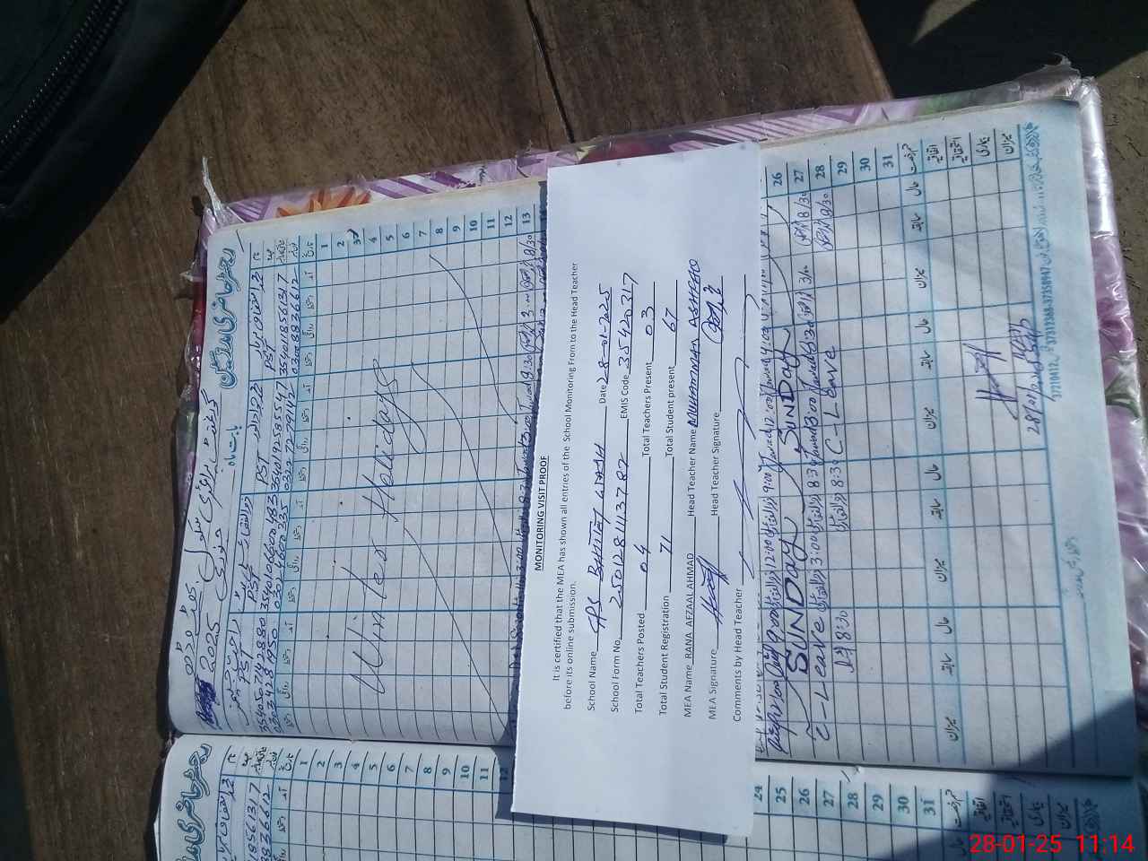 | Attendance Register | Head Teacher | MEA with School | Visit Proof |