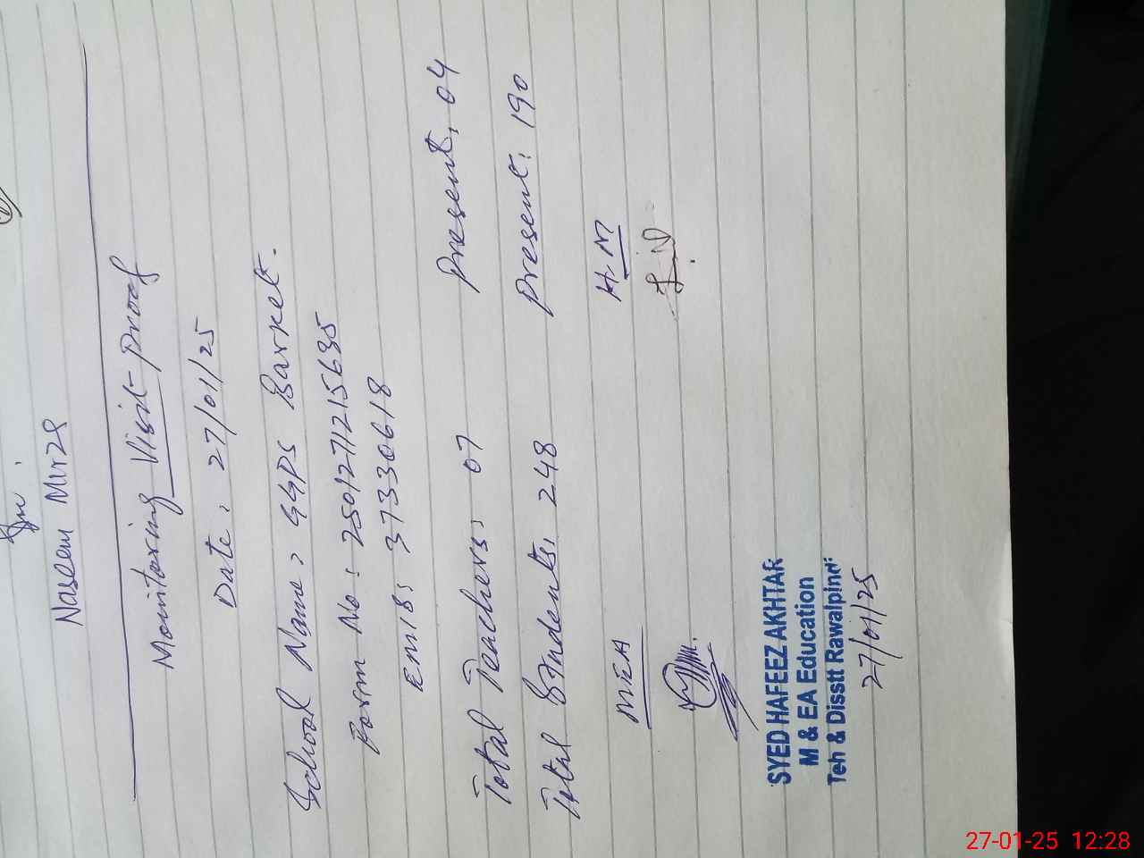 | Remarks (Use Separate Page if Required): NSB record not shown in PMIU app Students of class 4 listed in pmiu app are not updated 10 students are in class 7 while rest all students have left school | |||||