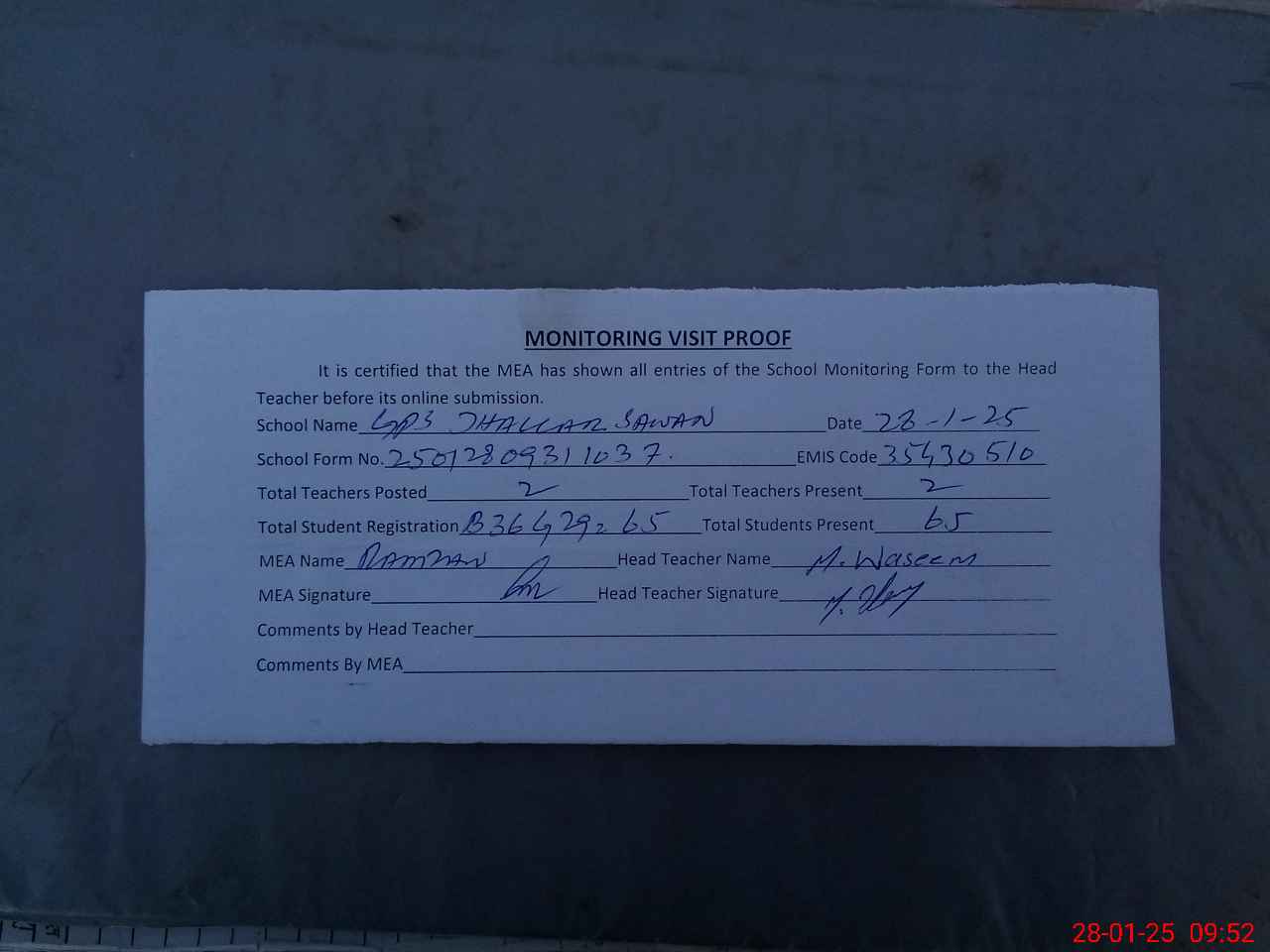 | Attendance Register | Head Teacher | MEA with School | Visit Proof |