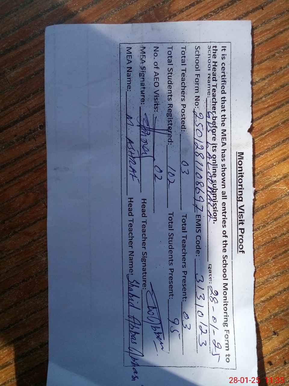 | Attendance Register | Head Teacher | MEA with School | Visit Proof |