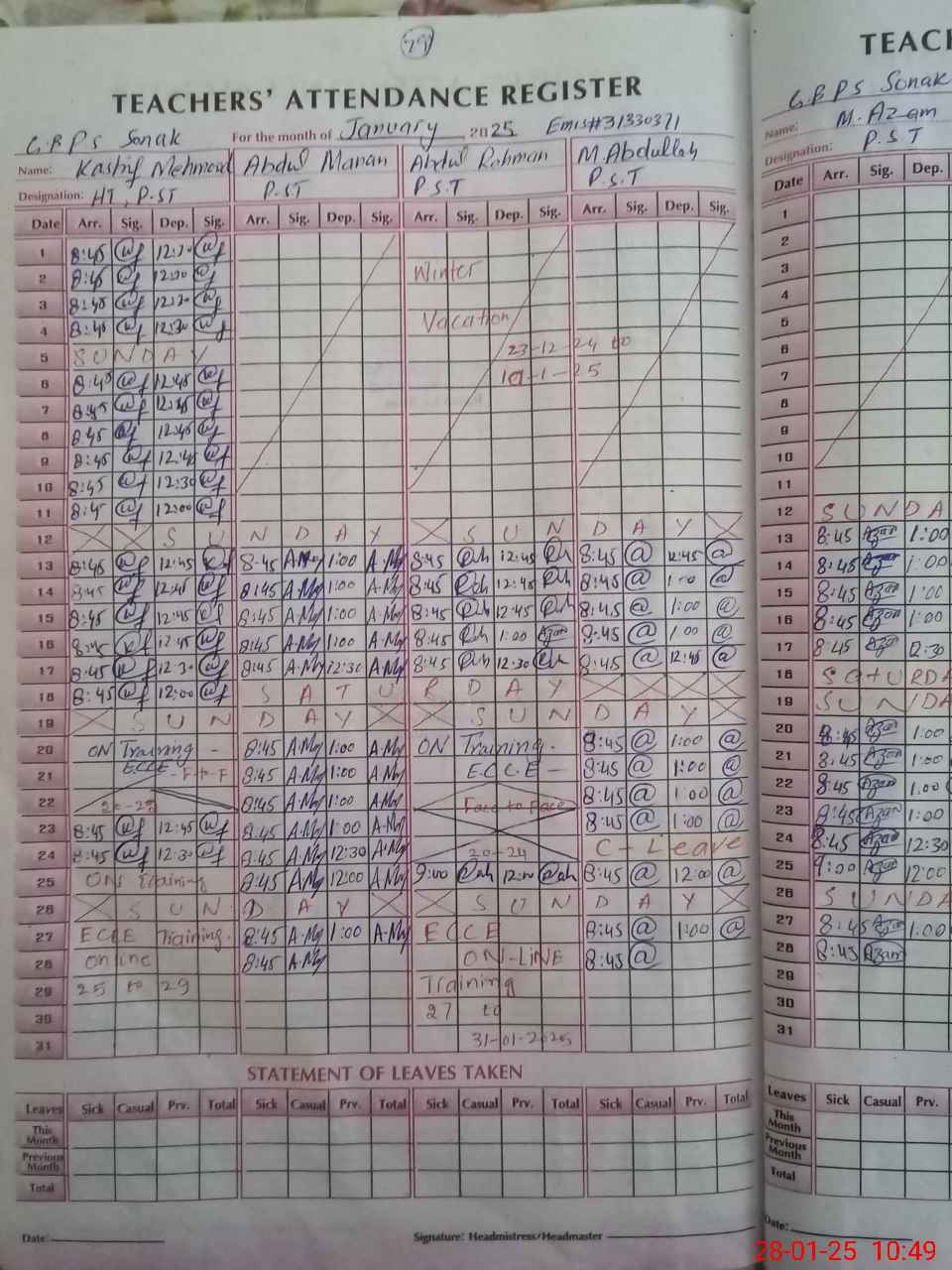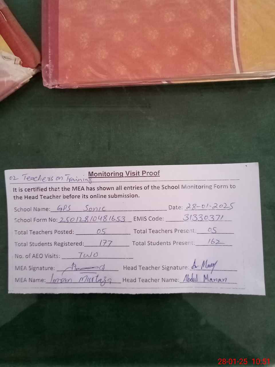 | Attendance Register | Head Teacher | MEA with School | Visit Proof |