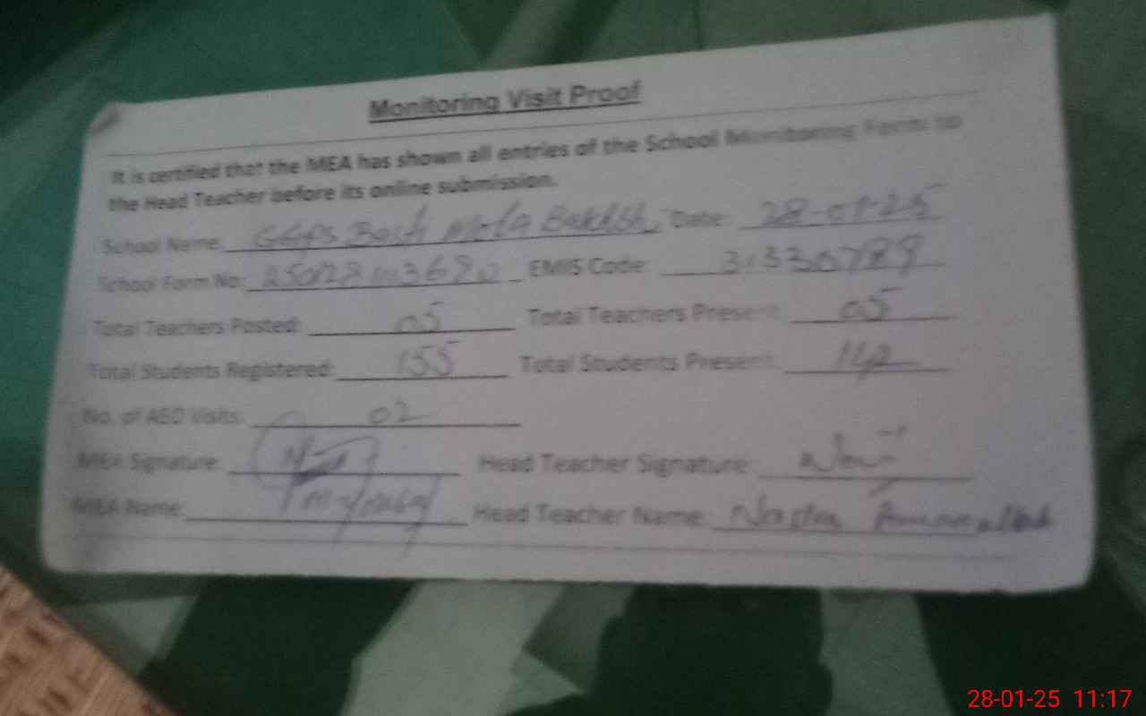 | Attendance Register | Head Teacher | MEA with School | Visit Proof |