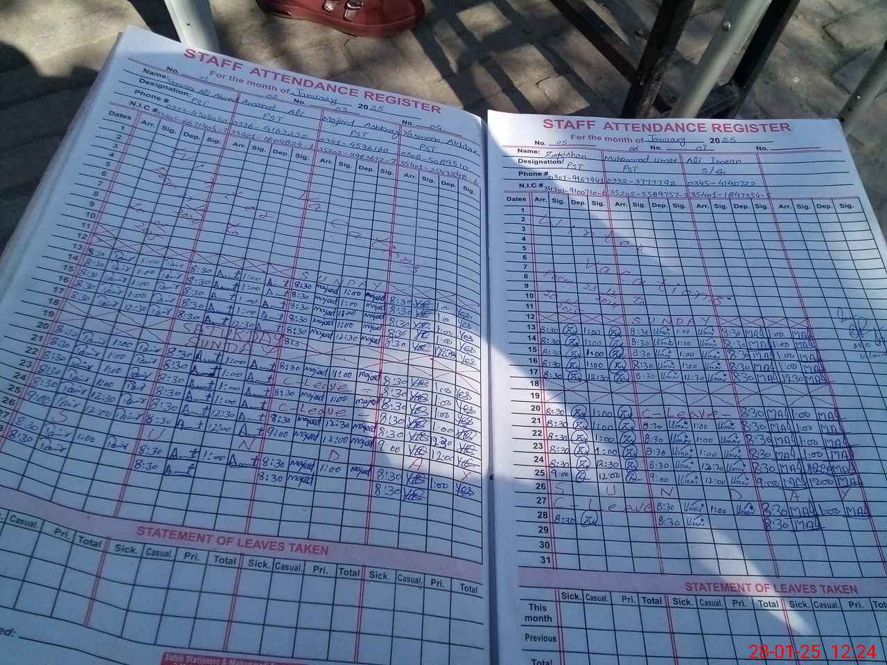 | CNIC | Full Name | Designation | R/C | Absence during last cal. month |
